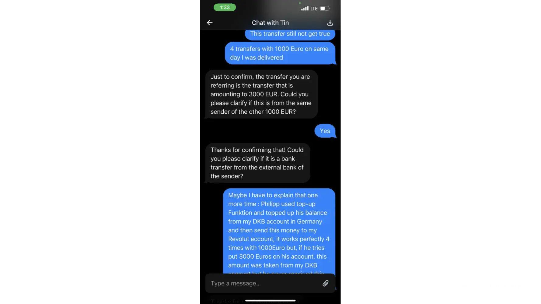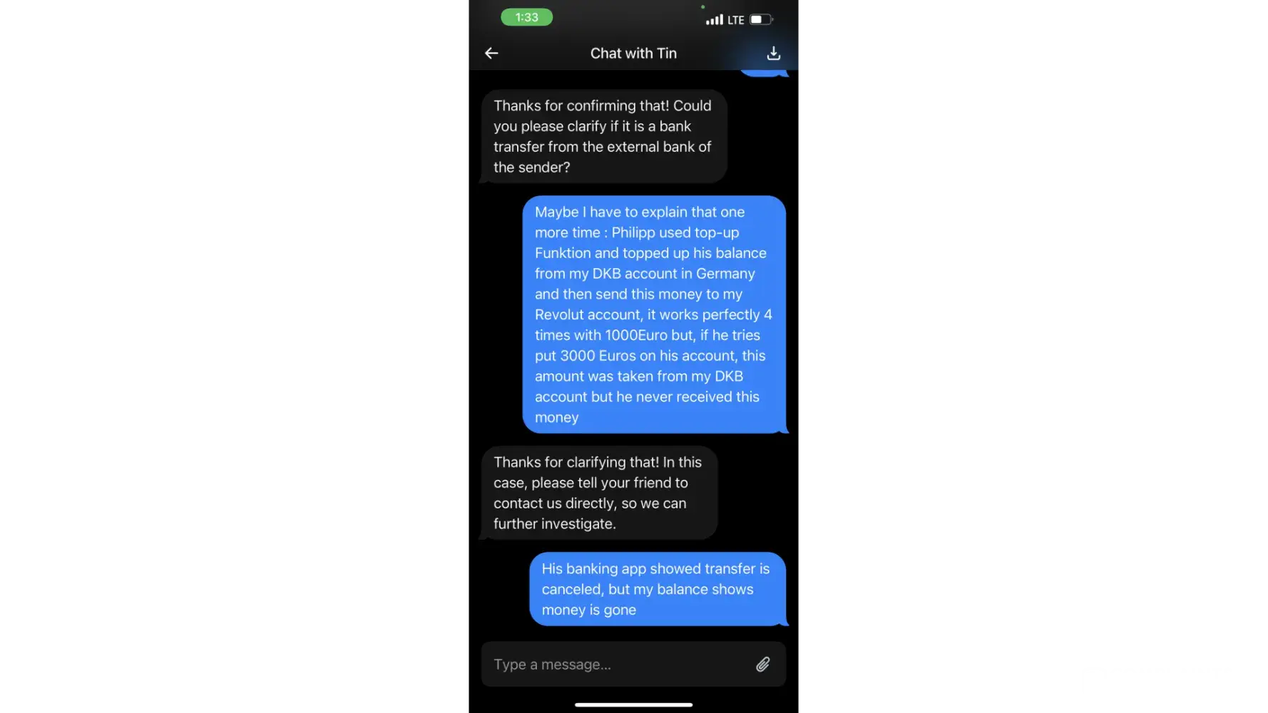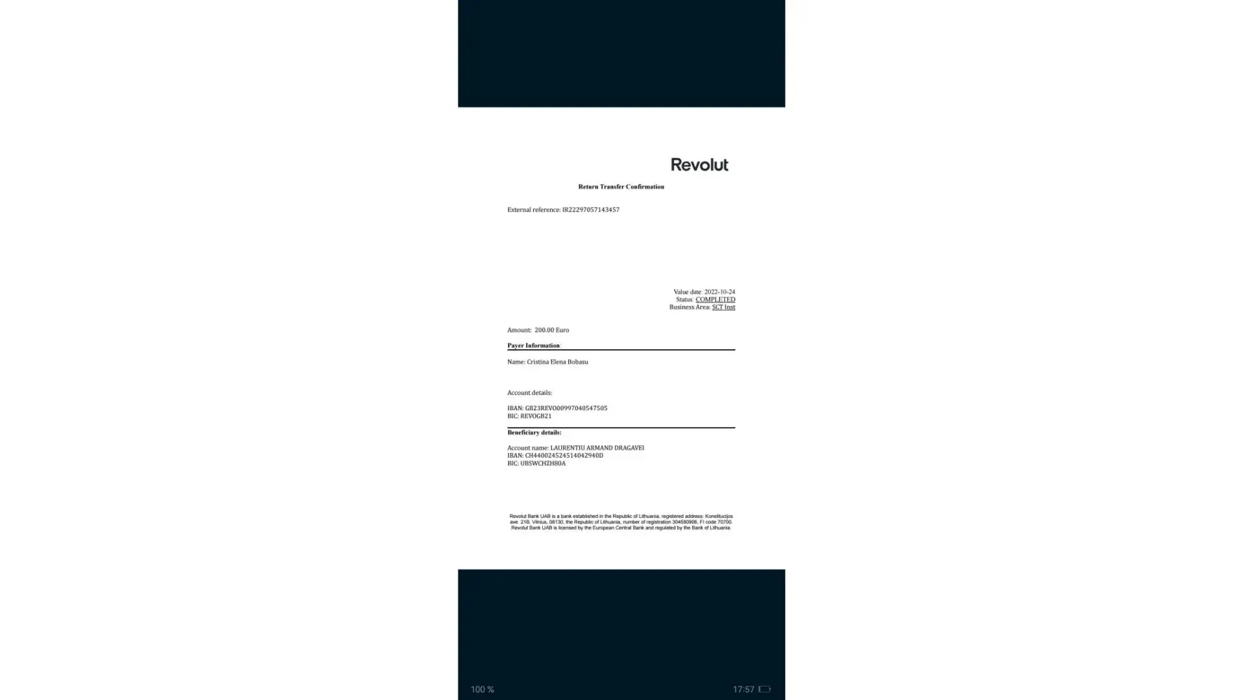 In 24.10.2022 my brother, Dragavei Laurențiu Armand, sent me 200 EUR via my revolut account. The money appered in my account. Revolut said the amount was sent back to sender, but the sender ( Dragavei Laurențiu Armand) did not receive it. It has passed a month and all they have done was to sens me a paper which has no signature or stamp where i can see the transfer was made. That paper i could have made on my computer. IT does not seem real.