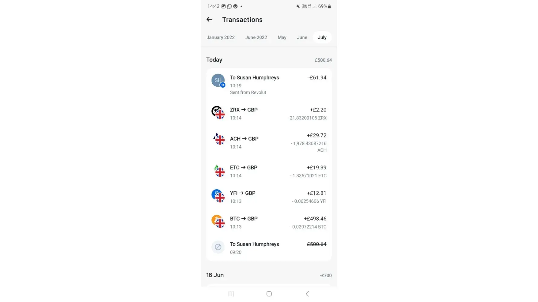 From 01:00 on 15th July 2023 40 transactions occurred on my Revolut account. Money came in as well as being withdrawn. Some in my name but not my details. Others in names I have no connection with. I the transactions were on both sterling and euro currencies. My greatest loss was the crypto accounts I had which were sold and moved out of my account.