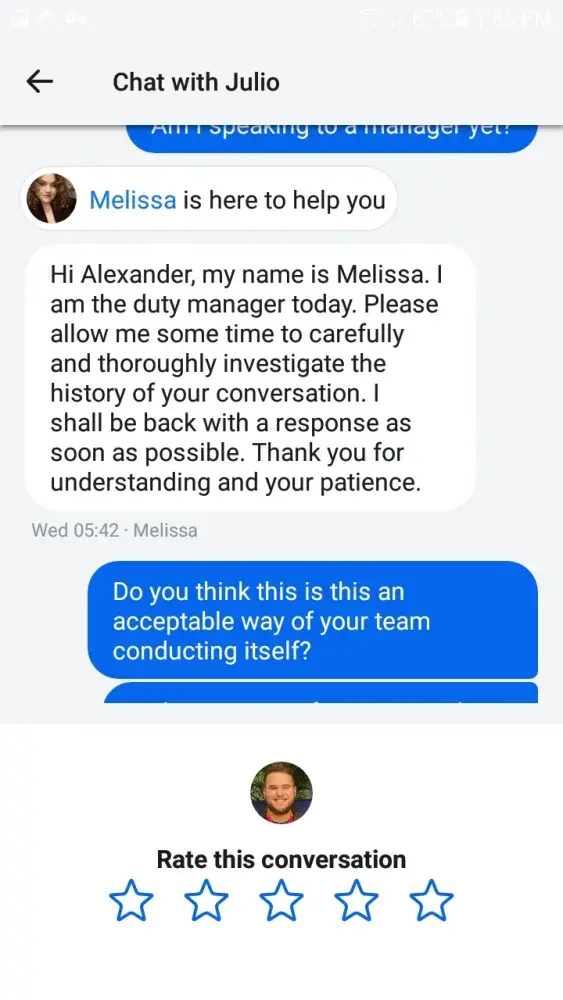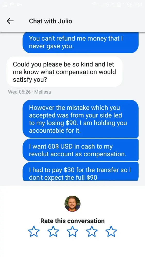 The manager attempted to divert the conversation away from the issue for over an hour until I insisted that my issue was the failure on Christian's part to solve the issue as it came up. When she did finally admit that a member of her team had failed to do their job, she offered me compensation of a free upgrade for three months to their premium package. Earlier in the year I showed intention to upgrade to their metal package, the highest upgrade possible and had explained to the floor manager 'Melissa', that after this lapse of trust with their company, having already spent over 14 hours at this point dealing with their customer services, that I was uninterested in continuing my relationship with Revolut altogether, this offer was an insult to me as a customer.