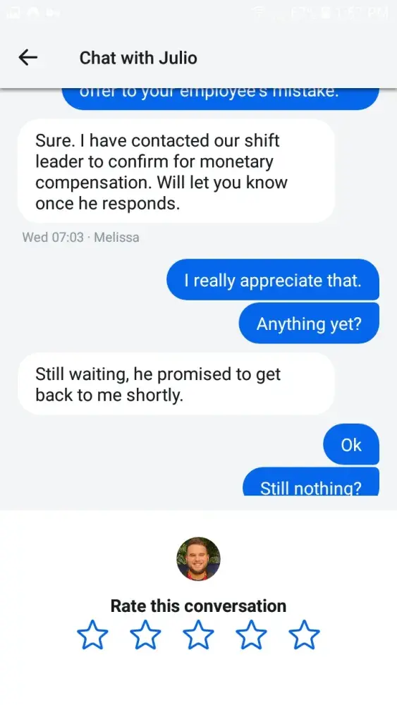 Melissa claims, that she sent a request to a 'shift leader' to permit monetary compensation of the $60 that I lost as a result of their negligence. And so I continued to wait, see print screens, for some two or three more hours. Melissa consistently insisted that they said they would get back to her soon and that she was waiting for a response. Eventually, having spent my entire 30th of December online talking to these people for over 10 hours on one day and at least a solid 6 the day prior, I had to go to sleep. At this point Melissa had finished her shift, the shift leader had finished his, or so I have been told, and no answer was ever given to me on the matter. The next day, some other person had come online and suggested that their was no refund available as the charges were not made from their side.