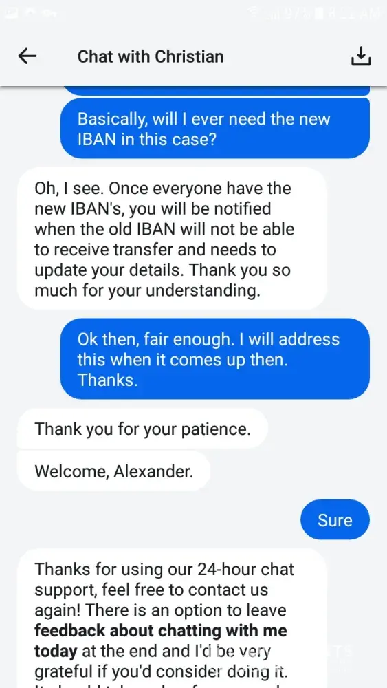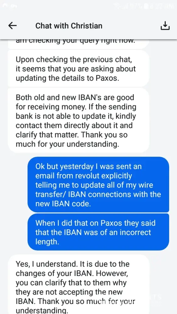 In early December I was asked to update my IBAN number on Revolut to comply with new standards set as a result of Brexit. Since I use the Paxos platform to transfer my cryptocurrency into Euro, I tried to update my IBAN number as requested by Revolut. I had some trouble doing so and referred to the customer care chat of Revolut for answers. I was addressed by one member of their team named 'Christian'. The outcome of that conversation was 'don't worry about it until it actually becomes a problem.' Please see print screens.