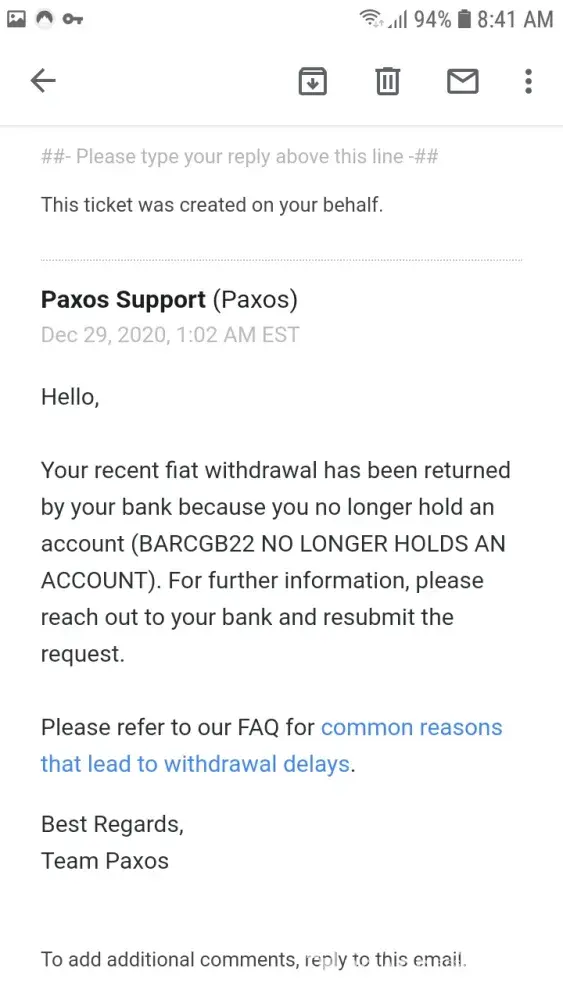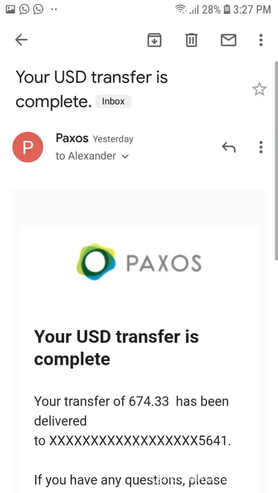 I eventually received my money, minus the $90 in charges that came from all of the back and forth through Paxos. I didn't get to go on the holiday I had planned because the money did not arrive on time and I wasted over 16 hours of my life thanks to the lack of taking the situation with the necessary seriousness that it had.