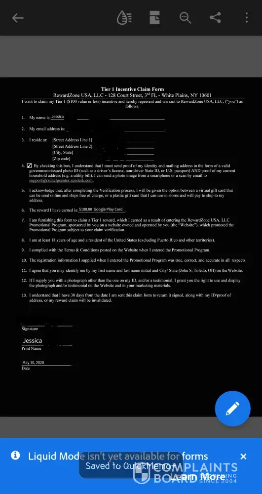 So I won $100 Google Play card by completing all of the incentives that they wanted me to sign up for and this is back in May that I finally got the paperwork to fill out and I filled out the paperwork and I filled it out through DocuSign and I sent it in along with my driver's license along with proof of address and within that paperwork at said that I would hear back on whether or not I wanted to get a virtual Google Play card or when in the mail well we are now going into July and I have not heard anything back from them on what my decision is going to be and I have enough then multiple times trying to figure out when I'm going to receive my Play card that I rightfully earned and I have not gotten one reply back I have also set the application in again with my driver's license and proof of address just in case they didn't get it and still no return reply and once again I did it again today. I truly believe that this is nothing but a scam I don't understand why they had me fill out paperwork and fill it out through DocuSign they didn't ask for any personal information so I don't I really don't understand and I read all the fine print so I'm really frustrated and thinking about reporting this company. As you can see with the attachment that I'm posting that I have the form I filled it out although you're not going to see my personal information because I made sure to scribble out with my stylus pen so that he has not smoked for something motion but did I do have the actual application and that I can fill it out. And even though I went through all of this yet nothing even though I have fulfilled my end with doing all these offers to get this play card and then I fulfilled my end with filling out this form and sending it back to then with picture ID and proof of address