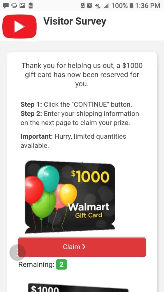 Ok, so I did the offer it said because it said I need to complete just 1 offer and then I will get my 1000$ Wal-Mart giftcard and I have not yet and it is frustrating! I downloaded the app they wanted me to download and did the subscription! It will not give me the choice to click continue on the website to collect my reward! This website is annoying and I don't know if I can trust in it!
