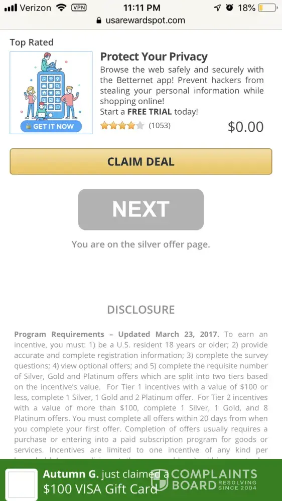 Before getting links I sent email to rewardzoneusa.com complaining that I finished the two offers and nothing came up on screen, and then I got the two texts with links that didn't work.