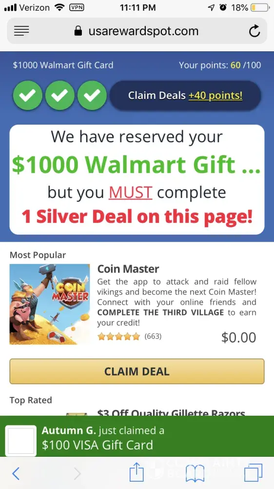 Rewards zone USA is got to be some kind of scam it tells you complete 10 surveys or sign ups etc for a gift card and I have completed all ten requirements and actually did an additional one and have not received any info on my gift card. I keep being told I need to complete one more. What kind of scam is this just so you can sell my info? I now have to make numerous calls to cancel subscriptions and wait on hold and deal with non sense all to be shafted on my reward... So where's my $1000 Walmart gift card?