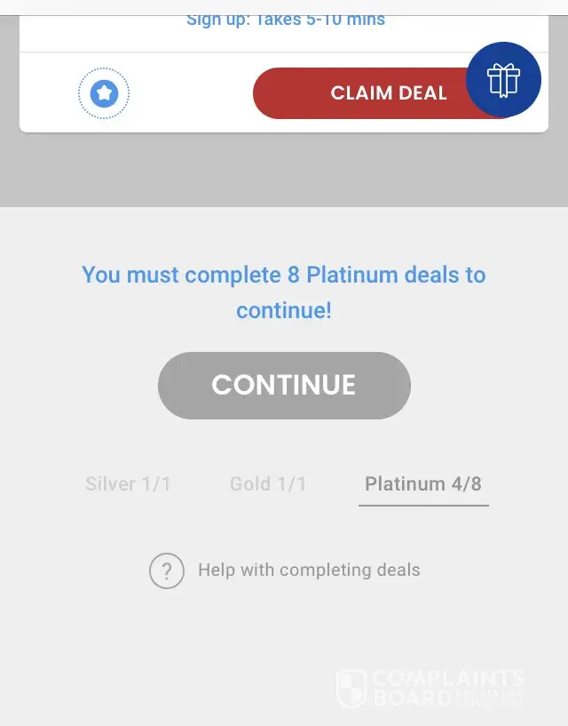 You have to complete 10 deals. One silver, one gold, and eight platinum deals. The website tracks your deals? But it will always get stuck showing that you're not fully completed even though you may complete more than the required Amount. So it will read like 1/1 silver 1/1 gold, 4/8, for platinum. The reward is for $1000 for 10 deals completed, but it will always get stuck showing you need to complete 4 more deals — no matter how many deals you do. But right then you will receive an offer for a $100 payout. I contacted customer and they said they would have to manually approve my deals. But hey, get this, you have to wait 14 days before they credit you, yet you have get everything done in 20 days. They are a scam through and through, when it was time to verify my identity they never sent me a link or returned any emails. They deserved to be sued for false advertising and more.