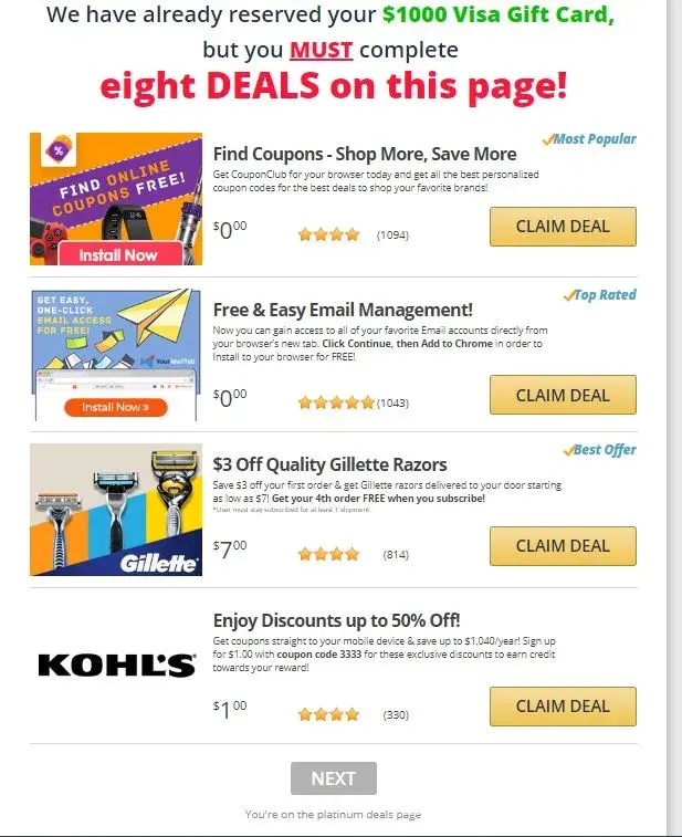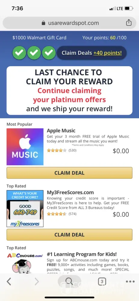 It says the I must keep claiming platinum offers and you will ship my gift card but there is no next button and I'm not excatly sure what to do. Also whenever I try to take the offer for the free trial with Apple Music it just takes me to the music app. I also don't feel comfortable giving my social security number or credit card number to these websites
