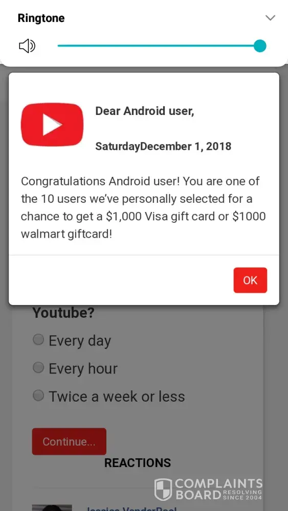Survey for you tube. It pops up I did not ask for this to be on my phone I have not interested in taking any surveys for anybody that I don't myself solicit I don't want this crap on my phone I'm trying to look something up and this crap pops up I lose the website that I was on and I have to go back it's a pain in the [censored] and something I don't want it needs to stop I don't want anything to do with any of your company's or whatever it is you guys are trying to sell or push, I also don't want to sign up for whatever BS you guys are trying to pull up file a complaint with you!
