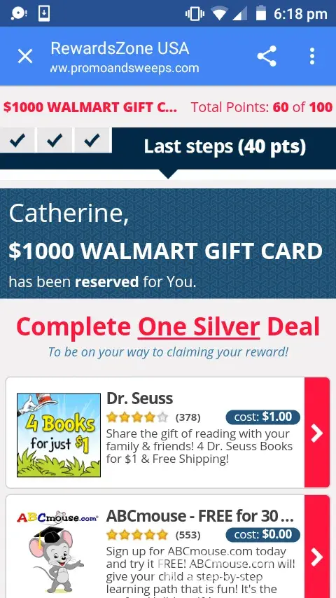 I did everything i was supposed to do for the $1000 walmart card and visa card and i spent over 30$ of my own money and also downloaded apps that messed my phone up. I keep being redirected to other offers instead of receiving something saying i completed all the steps. Please either send me the visa card or the walmart card because i feel stupid that i was fooled into believing this site was real. My name is tabetha and i can be contacted at [protected]. Please resolve this problem before i take legal steps. I have 8 kids and cant afford to keep loosing. Thank u