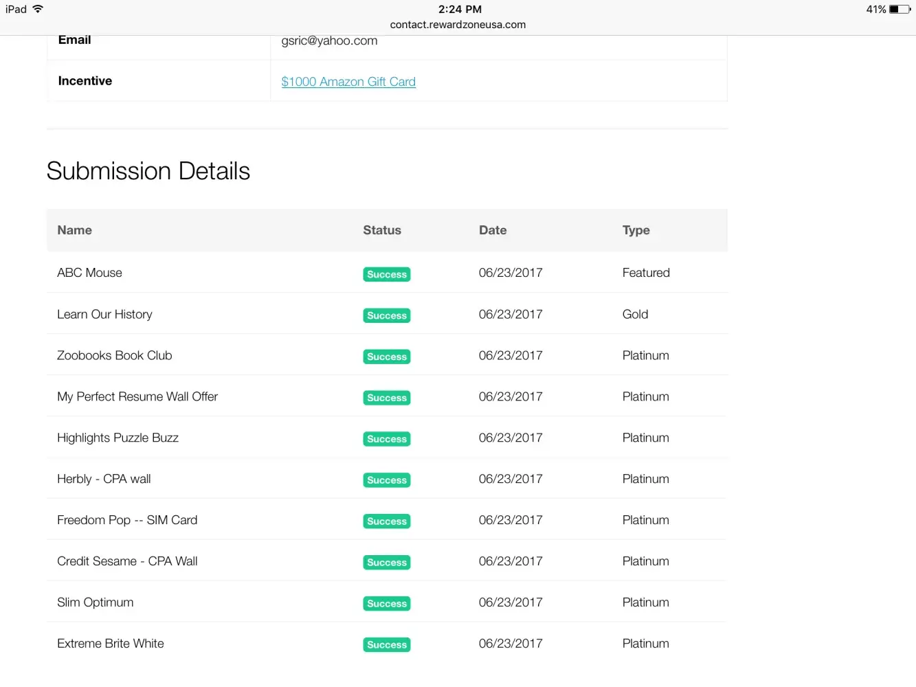 Back in June I submitted a requirement to get a 500.00 dollar check and the requirement was only for one silver offer, it even outlined that in the status to complete .I did and purchased ABC mouse .After that I went down below to see the status of my 500.00 dollar check.It said it was fufilled and all I had to do was claim it, so I did still has yet to come in emailed them and they told me I had not fulfilled the requirements. I needed to go for eight platinum offers . It did not say that in the offer . all it said was I needed to fill the offer .They truly are scammers, I would contact the companies who ever do business with them.