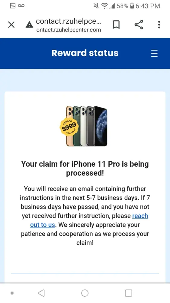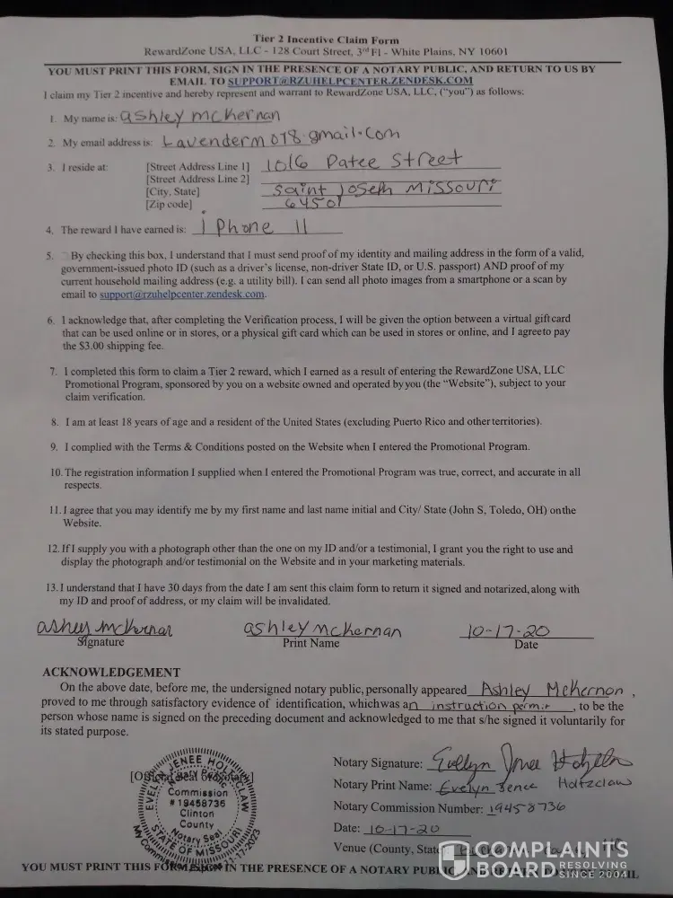 I complete a survey & signed up for multiple offers in order to receive a new I-Phone 11. I was even charged for some of products. I recieved my claim form from reward zoneUSA showing I had completed all the requirements. I signed and returned the form with proof of identity. I have not recieved the Iphone 11 nor any direct response since May 2020