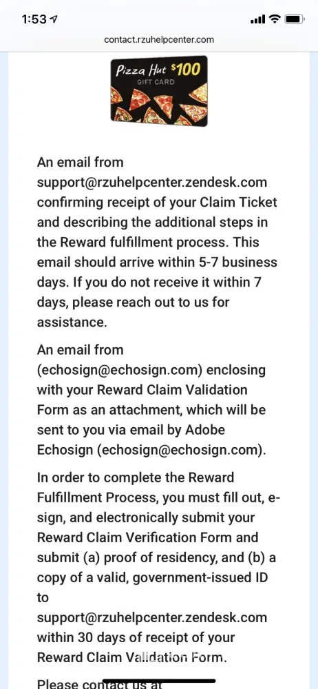 I have not received a confirmation email to sign for my 100$ Pizza Hut gift card and 2500 Pokémon coins. I have done all the requirements it asked for and received at least 3 notifications saying I will get a email from support@rzuhelpcenter.zendesk. It has been a month now and still nothing to sign for my rewards. I just received a text saying last day to receive my rewards but no confirmation email to get my rewards please help me get my rewards