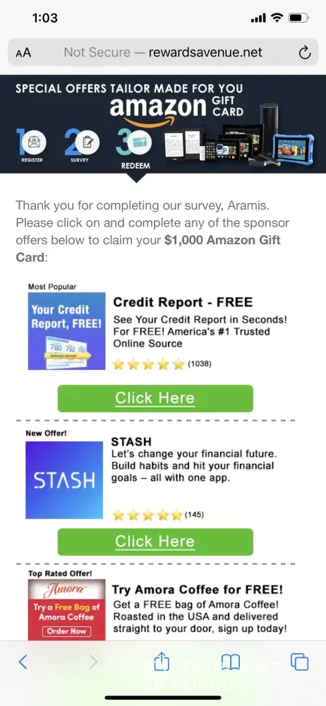 So I get a email to do a Survey and complete the deals and I'll get a $ 1000 gift card from Amazon so I did and guess what no gift card this has happened 3 time already and I'm done playing mister nice guy so or I get my [censored]ing gift card or all hell is going to brake lose ya need to stop scanning people that's not funny wrong guys to [censored] with My gift card now please