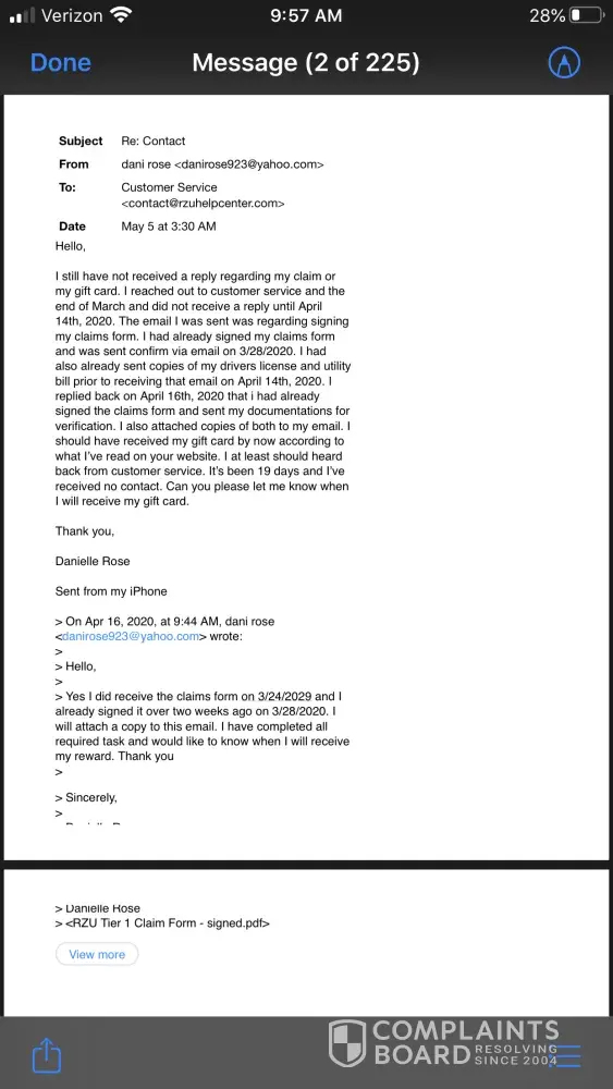 I completed all incentives for my reward, signed the claim forms, and sent all verification documents promptly on 3/28/2020 I have emailed customer service repeatedly and have not received a reply or my reward.