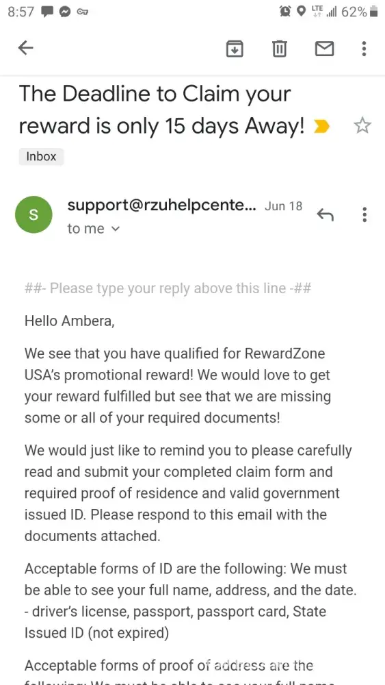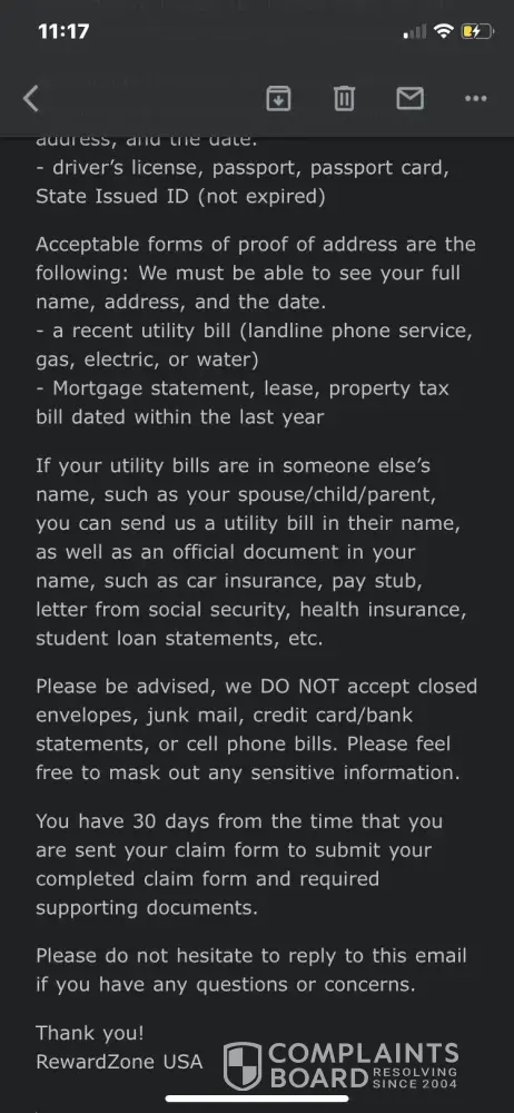 I originally received instruction to send a notarized copy of the claim form as well as proof of identity, I completed all of this a week ago, I have sent several emails and haven't gotten confirmation that my information has been received or the status of my reward, it said that everything had to be submitted within 30 days, that was on May 23rd, I am worried that they are stalling and will suddenly reply after June 23rd and tell me that I'm missing something in order to deny me my reward.