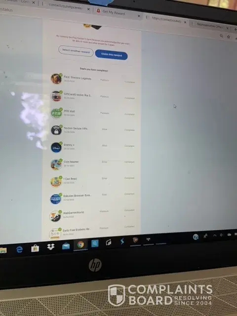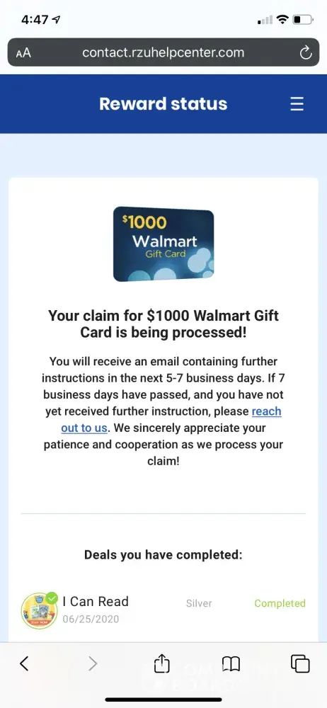 Reward Zone USA I am complaining because they said finish 1 more deal and I get 1000 dollars walmart gift card after I had done it they to do 8 more deals