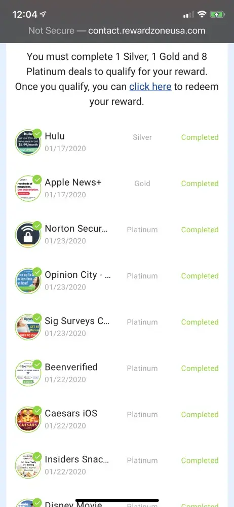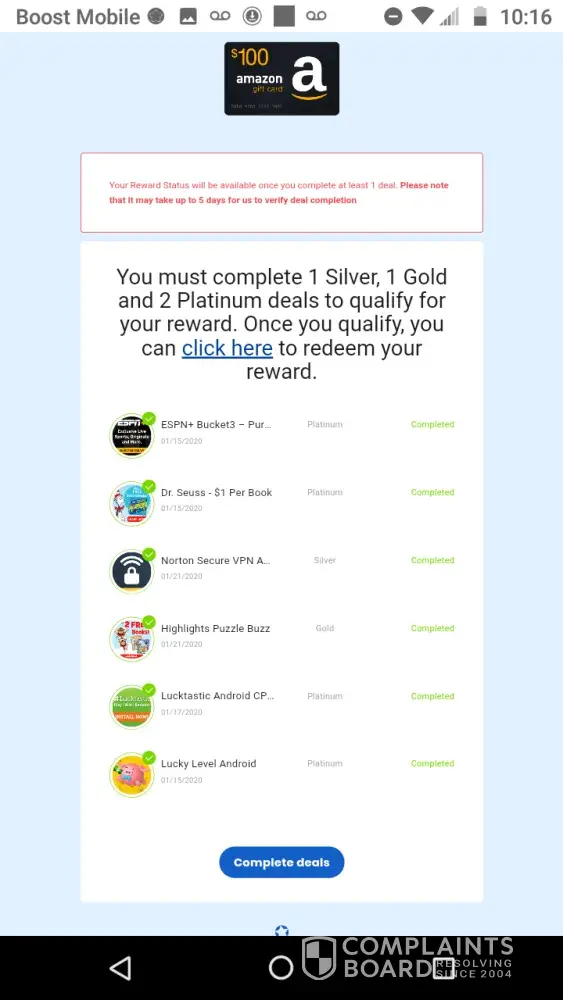 It said I had to do one silver deal and I did yet it didn't show that I did, i've seen replies to complaints saying you had to do multiple but that isn't what it said on the screen, when you don't mention the deals until i've given you all my information and then say you have to complete one when really you have to complete multiple which is then more information to give to other sites... Just think that's wrong, really feel like I wasted my time on this