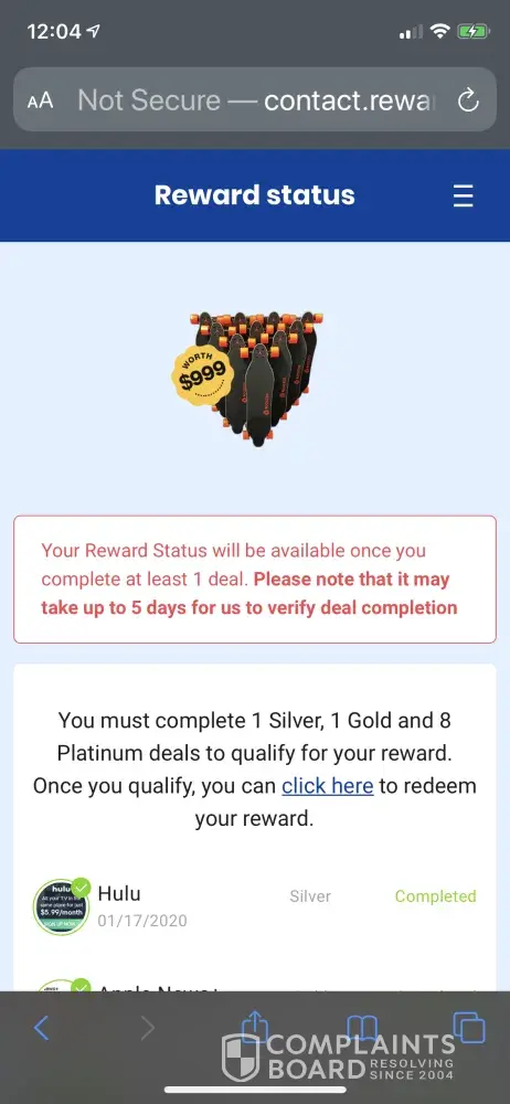 I have completed all deals and sent in proper paper work along with the notarization and signature of a tier 2 reward with no further contact from company. I have filed this claim and one with the B.B.C this is just a scam to get you signed up for subscriptions you forget about. I just want my reward. A friend had done this and she received hers so I gave it a try. But no prize