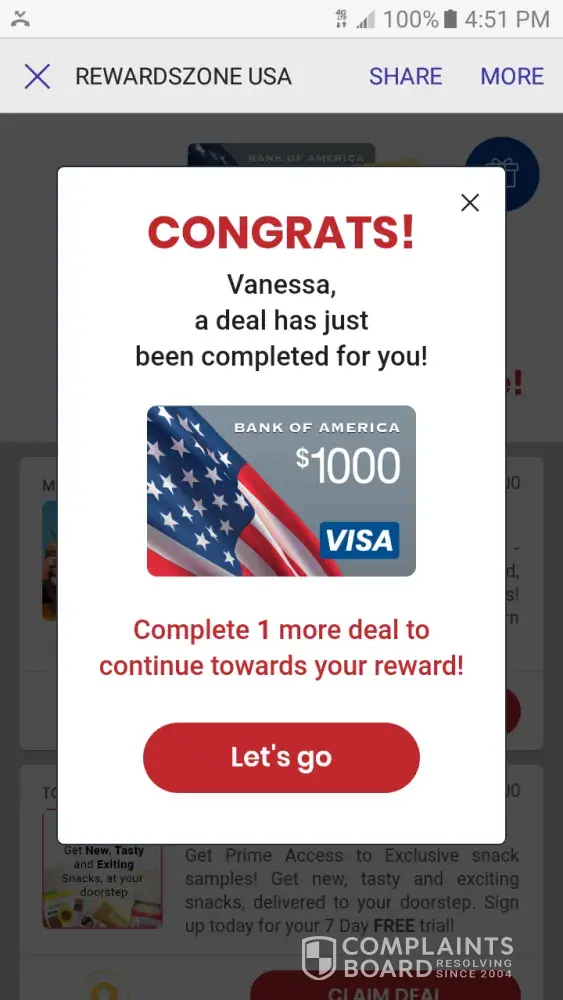 I played rewards zone USA. And completed all 10 incentives plus 2 extra and they are saying I still need to compete 1 .more deal which I've. completed 12 I have screen shot to prove I did all requirements now I want my reward which was 1000 dollar UK bank of America card please help me to get my reward I deserve.thank you
