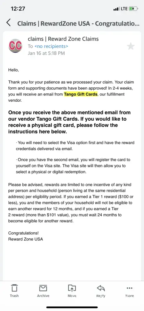 Reward Zone USA Reward that I didn't receive but I did 12 incentives