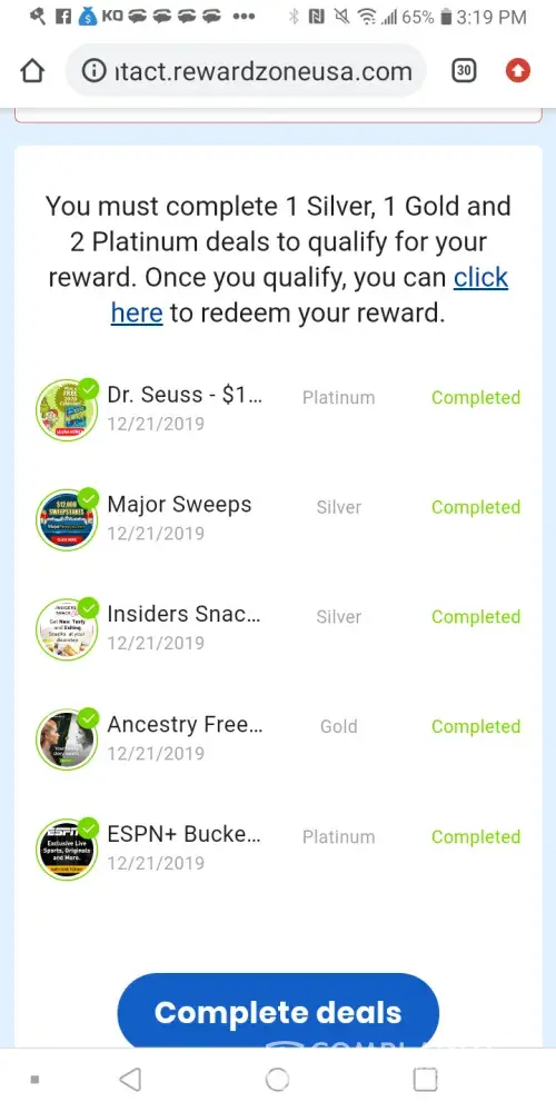 Reward Zone USA completed deals no reward