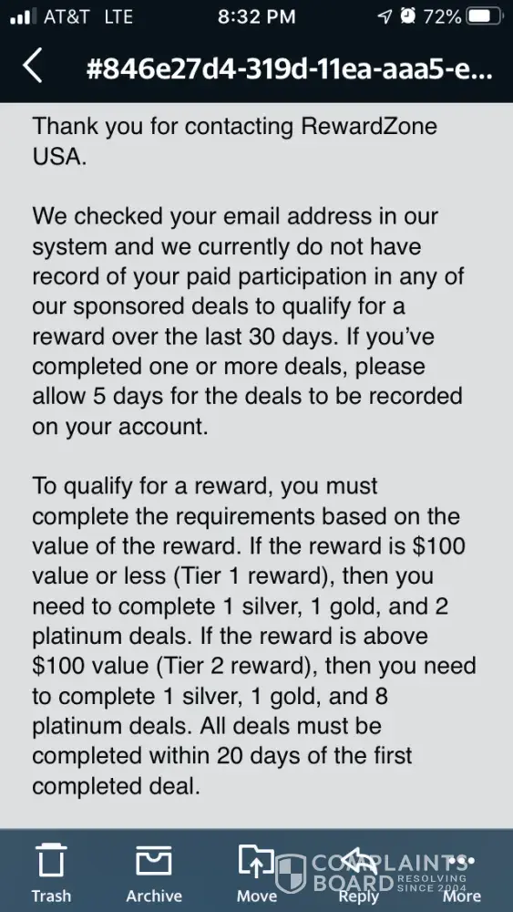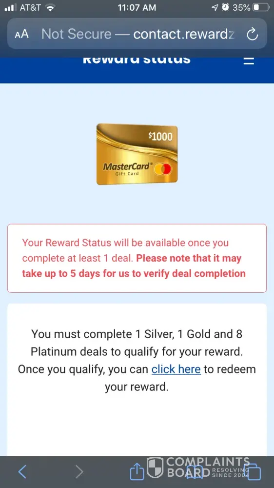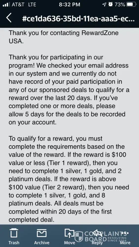 I expect a response hopefully filed with the bbb because they tried to play me to get me to sign for a 100dollar reward when. I completed the tier 2 reward. For an iPhone X and you can only do one not both so well wait and see because I’m not singing off on. A measly 100 dollar reward when they owe me a grand for all the personal info I gave that they share and I dot. Mind the spam sometimes you find little gold nuggets in the spam and I know affiliate marketing they should be paying this out because all offers completed same day no echo form yet will keep everyone posted on whether or not to continue using this site if they try to get you on the cheaper offers ebbed though u completed and registered under a 1000 dollar offer as the picture I posted shows platinum2 means it’s a tier two platinum offer we’ll see they don’t respond to emails at all soo I filed a complaint here and with the bbb I don’t have time for this but if I’m allowing u to share and sell my info and try products and keep some pay up the thousand dollars you owe me . Everyone’s information is worth money alone let alone all the offers su have to do to get the “free reward” send the echo form for tier 2 and lets get on with it u get paid by sponsors I completed u get paid for sharing my info .. pay up reward zone