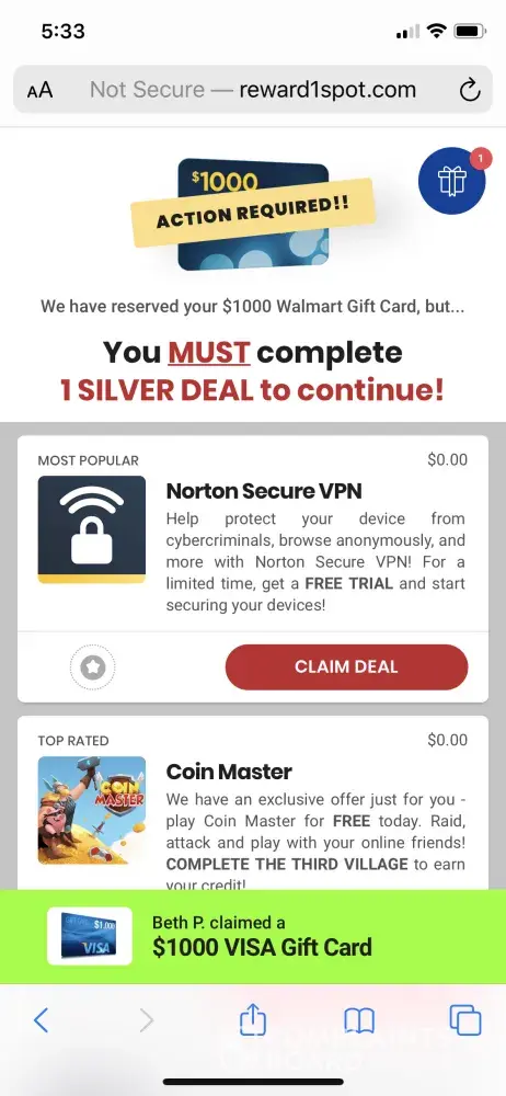 Told me to complete the deal in order to receive the 1000 dollar Walmart gift card.
