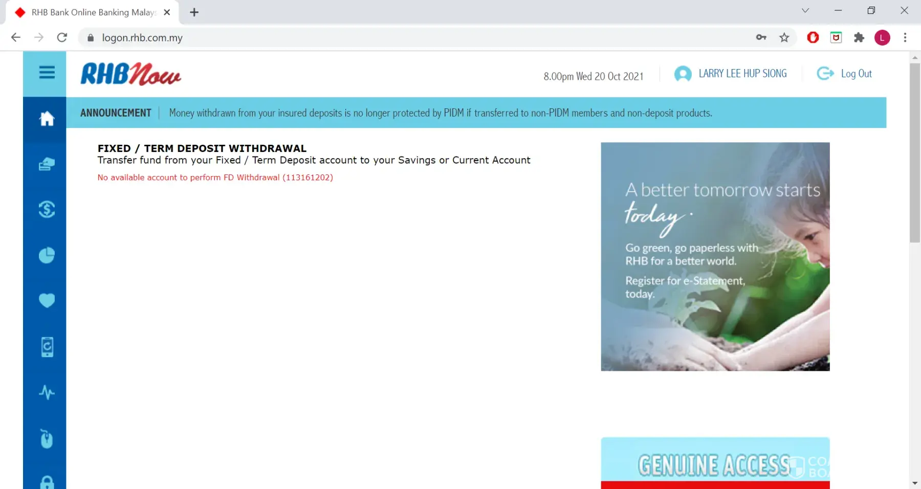I am unable to withdraw online my e-fixed/e-term deposit because RHB computer system is unable to link my online fixed/term deposit withdrawal request to my savings and fixed deposit accounts. I have made a request for RHB on 24 Sep, 2021 to provide customer with online e-fixed or e-term deposit withdrawal facility but your customer relations officer have directed me to a incomplete, non genuine and unusable facility.