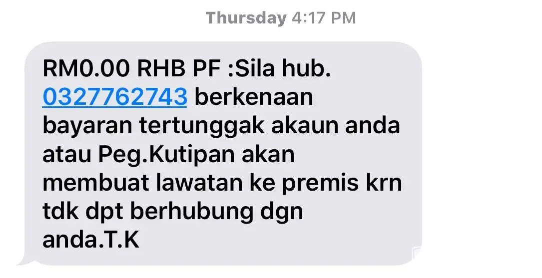 This is the first time and also is the last time to apply this personal loans. I feel others bank better than rhb. Yesterday, the officer calling me but cannot reach until calling to my office.. A few day before, the rhb bank calling me morning, afternoon even evening, when I pick the call and say hello many times also no people answering. This is not the first time but many times and I feel that may be is the scammer. Then after this received a msg said the the officer will go to ‘premis', if didn't paid for outstanding balance. I feel how can become the ‘along' already.. I very disappointed with the rhb bank. If outstanding also will charge interest or what? Like other bank, send a letter to inform, then ok lar. So for what need to call until my office to let me know the outstanding balance rm100 something.. I borrowed the loan from bank not from "along".. If anything then send a letter to the house to inform the the outstanding balance and will charged amount. I'm very very disappointed with this kind of service.