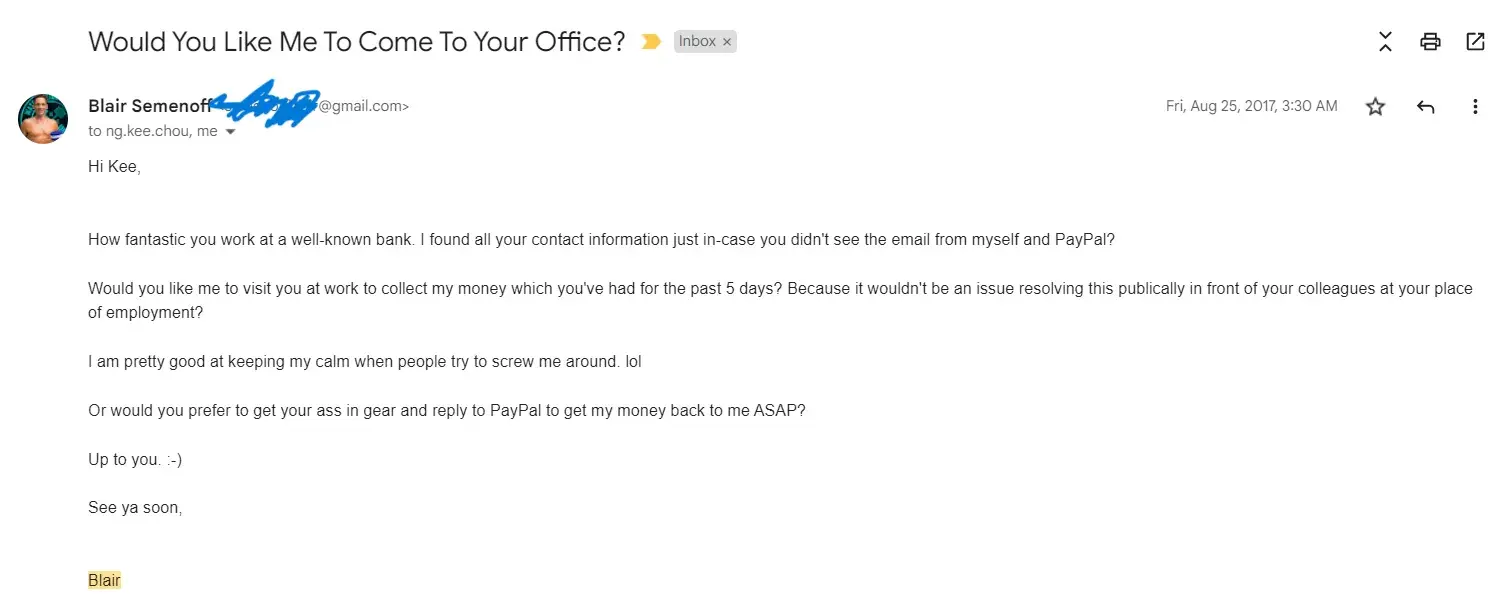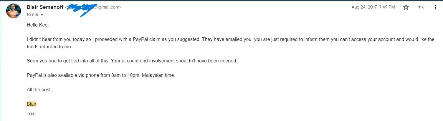 kee here, the accused. I never solicit any monies from this guy Blair. He got my PayPal address off of a common friend and transferred the money without my knowledge. furthermore, it was the wrong email, i could not access as it is linked to a UK mobile number which i discarded more than ten years ago. And no, PayPal does not allow you to bypass security measures by sending them an email, how sweet. PayPal is an escrow service, Blair didnt have the capacity to read it up and learn how they function.