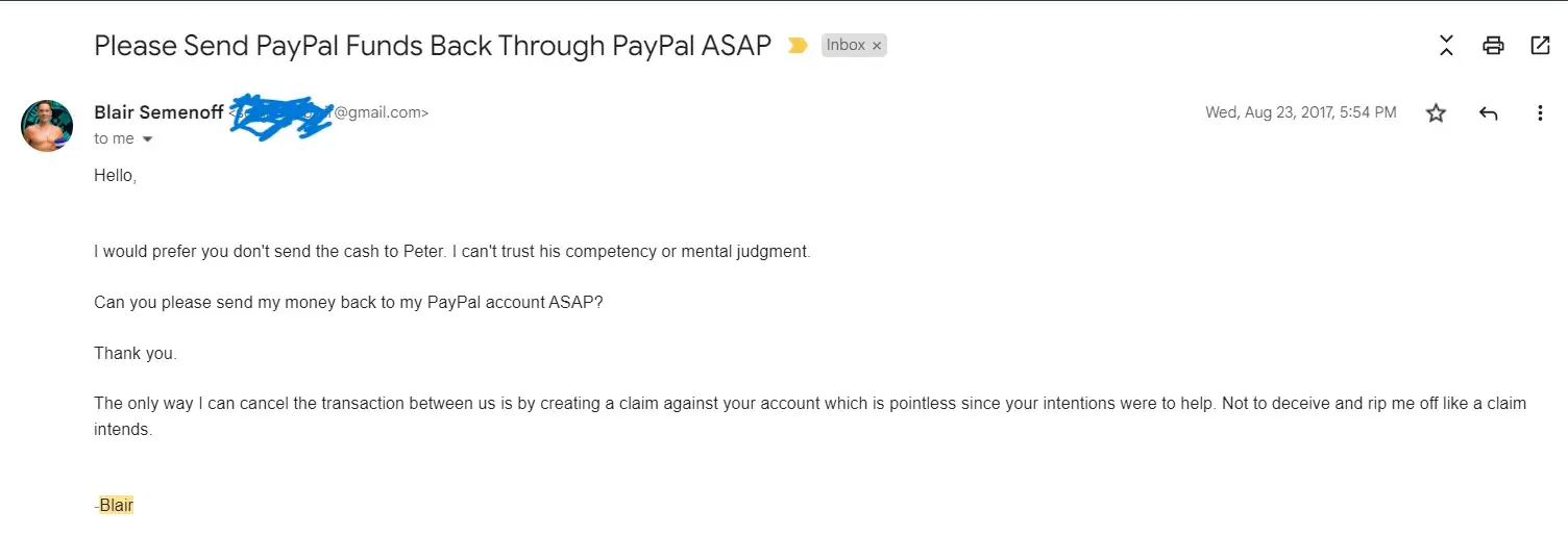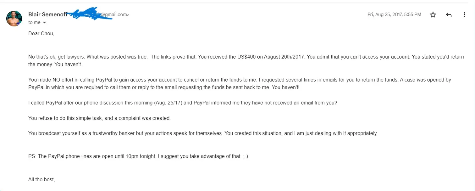 -As well as an email directing me to wait 10 days for PayPal to return my money rather than simply calling or emailing PayPal requesting they return the funds to Mr. Semenoff. (August 25/2017)