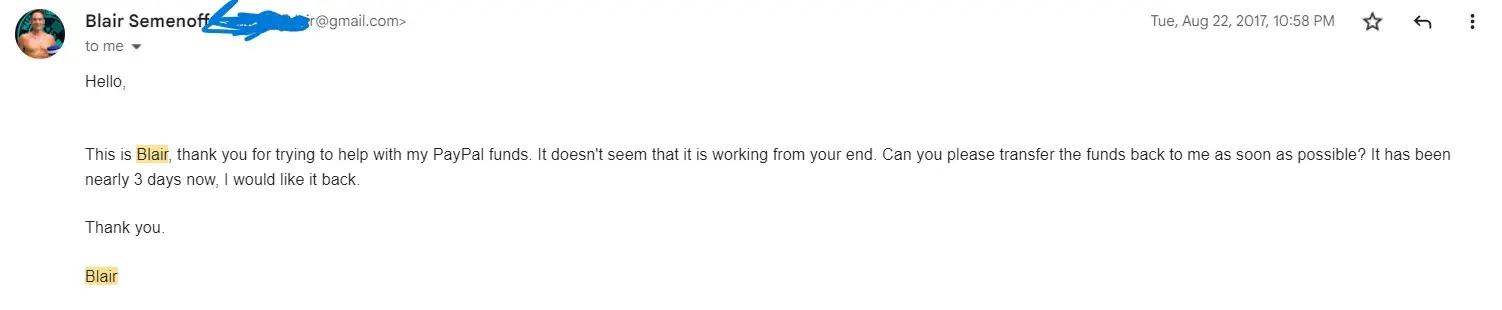 Just by his comments alone, one could easily deduce there was no attempt to steal his money. anyone familiar with PayPal knows funds are returned if unclaimed and since i never contacted payapl or logged in as Blair confirmed, there was no interest in withdrawing his money and it would have been returned as per how PayPal works, famously.