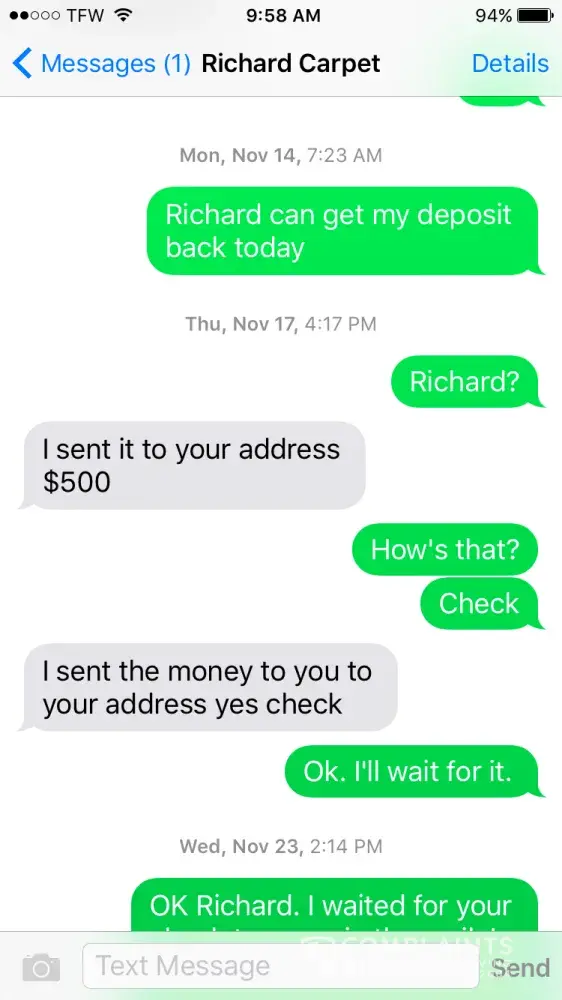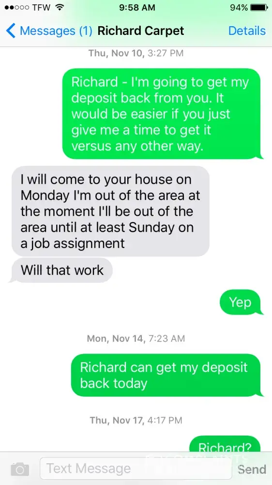 Richard ripped me off $500 cash deposit. Never did job. Promised to return money. Never did. See supporting text screenshots from his phone. Got ripped off by Richard Rokowski from facebook [protected] took $500 cash deposit and never did job. Always had an excuse. Kept wanting me to put money directly into his Well Fargo account under Richard Rokowsi LLC. I asked for a refund for weeks and he replied by text see below that he would return the money. He Never did. I gave him plenty of time as you can see from screen shot of his text replies. Wife found numerous people on fb with same scenario.