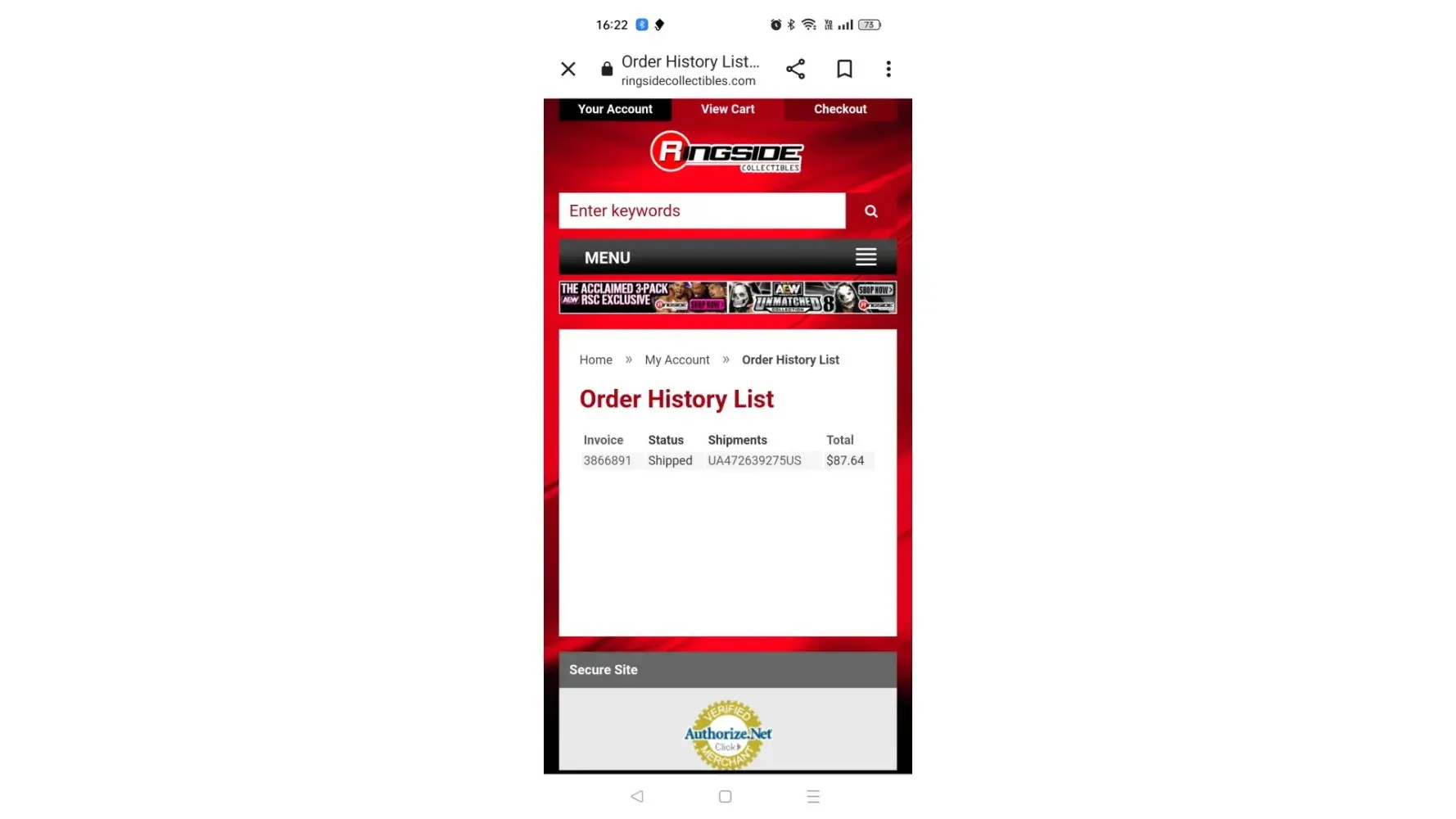 I ordered a product from Ringside Collectibles on Sep 7 2021