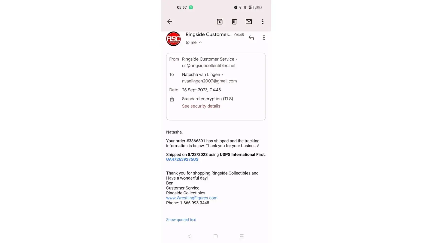 I ordered a Cody Rhodes figure for my son who is obsessed with WWE. It was our first time ordering from overseas as the options for WWE action figures in South Africa is very limited. I ordered the Cody Rhodes figure on 08/23/2023 and was very excited when I saw on the tracking status it has departed from Atlanta on 08/25/2023. However, it has been stuck in this status since then. I have emailed several times as the status is not changing, only to be informed that it is on its way as it is in transit. A little more than a week ago, I went on Ringside Collectibles and chatted online with Ben asking about the order. I was told by him to wait until 08/23/2023 and speak to them again. I waited until the 23rd, but now the 'chat online' is disabled and you can only leave a message. Nobody is coming back to me about this order. My son has Tourette Syndrome and because of this is obsessed with WWE. He lives and breathes WWE. If only Ringside Collectibles would have assisted me more in this regard, they would have gained a customer for life.