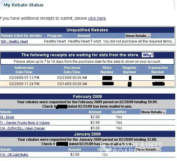 I posted three disputes on their website stating the Rite Aid Store had faxed the receipt to them and so I should not have to do anything further to receive the rebate check. I received two replies insisting I re-fax the receipt, even though I indicated I'm snowed in and their store originally faxed the receipt.