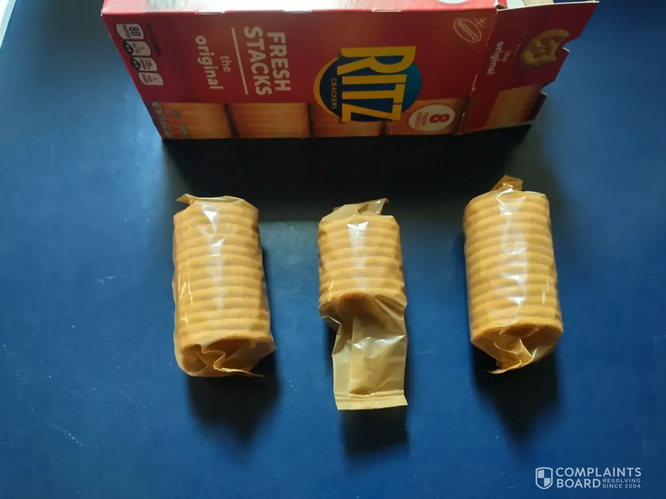 We have loved Ritz crackers for 50 years. We were surprised to buy a box where the crackers keep crumbling. They seem intact and the box is uncrushed but after I open a sleeve some of the crackers easily break into large crumbs.
