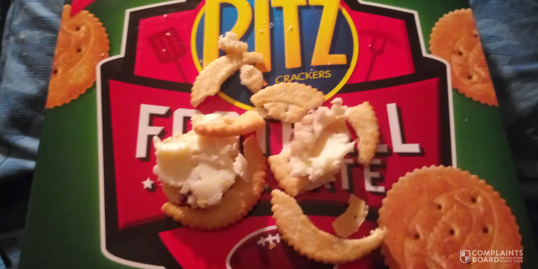 I spend a lot of money on having a football party and I bought five boxes of Ritz football tailgate crackers and every single one of them breaks apart as you tried to put cheese on them and my guests were very upset about not having crackers with a cheese and it messed messed my whole tailgate party up and I am very angry crumbs all over the carpet my dogs are was choked on the crumbs twice but he's okay but I am still very angry I would like you to discontinue these crackers because they are a bad design and they do not withstand cheese