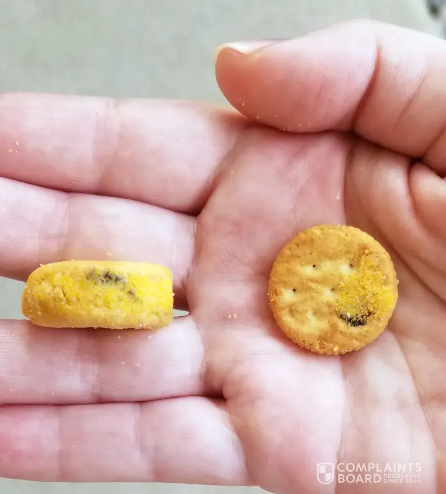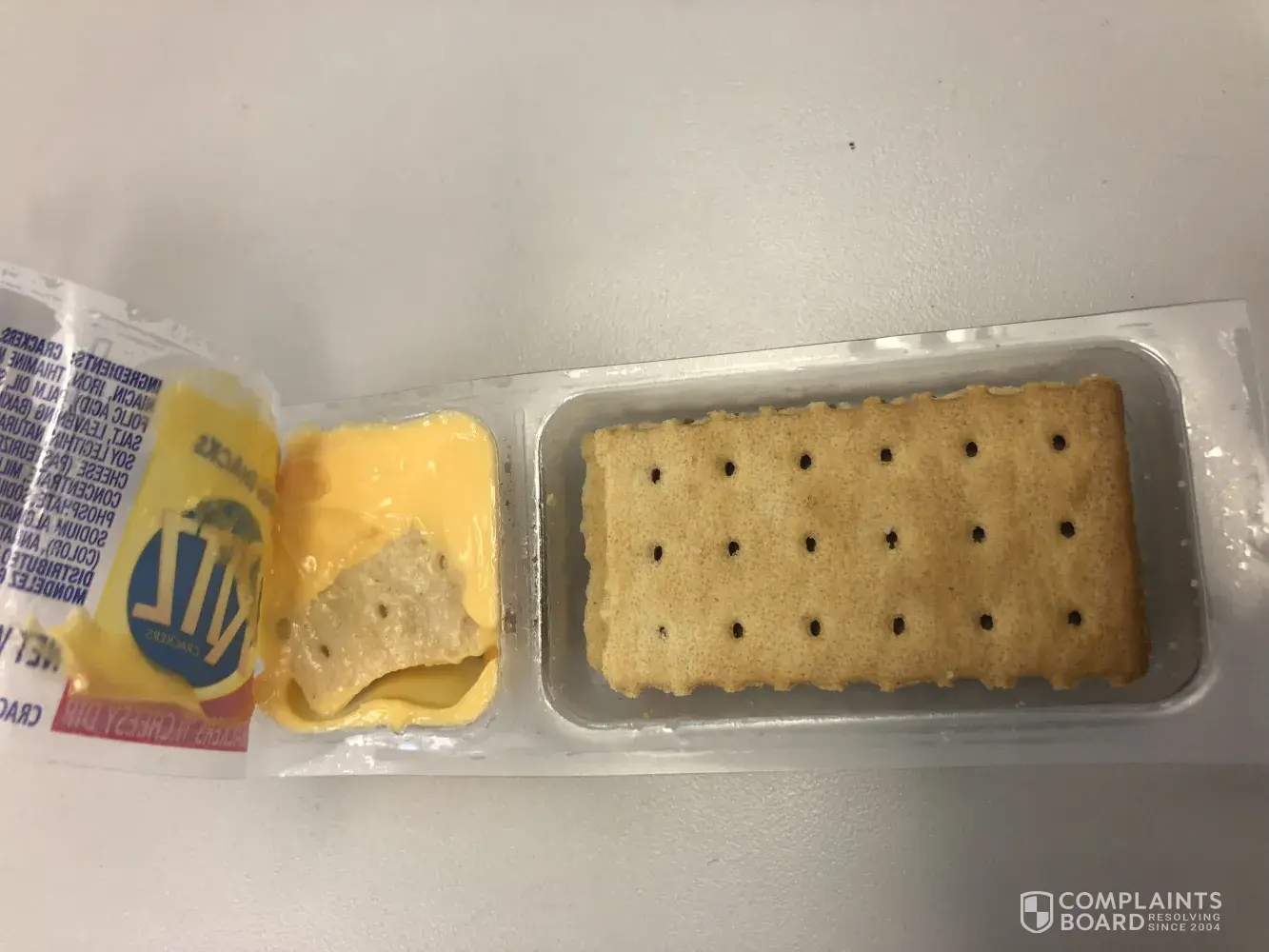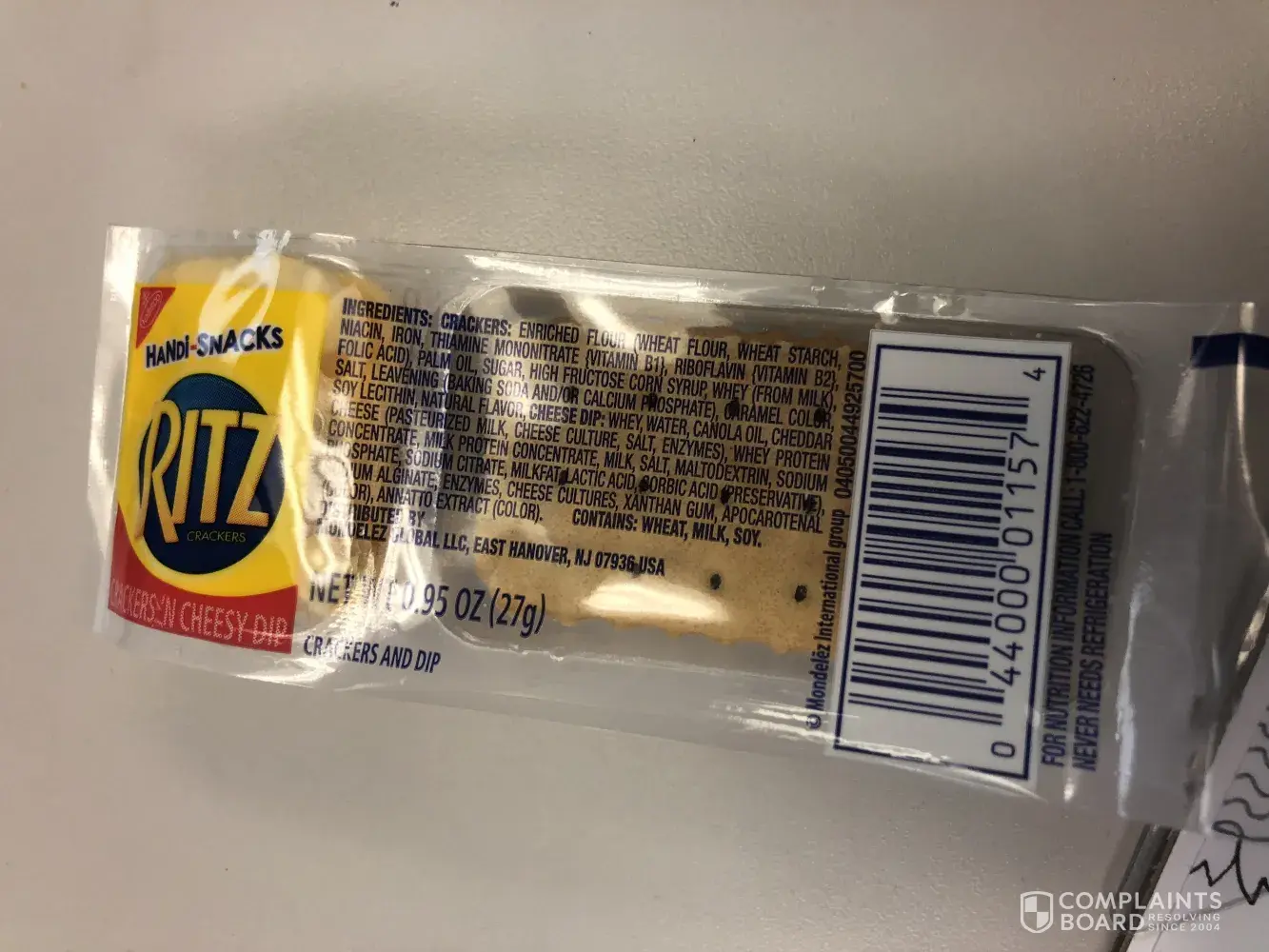 I opened a pack of the ritz crackers handi snacks crackers and cheesy dip and the cheese was miscolored and looked like it has a soggy cracker inside of it. I have not used any crackers from the package and am very disappointed that I feed this product to my children and have them as snacks myself. This is disgusting. Explain what you are going to do to fix this!