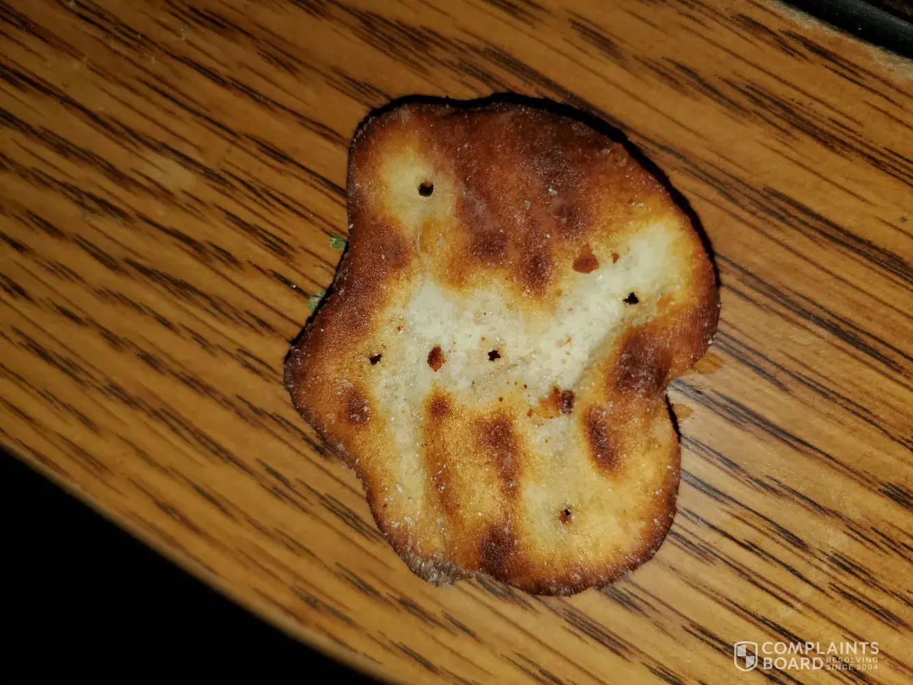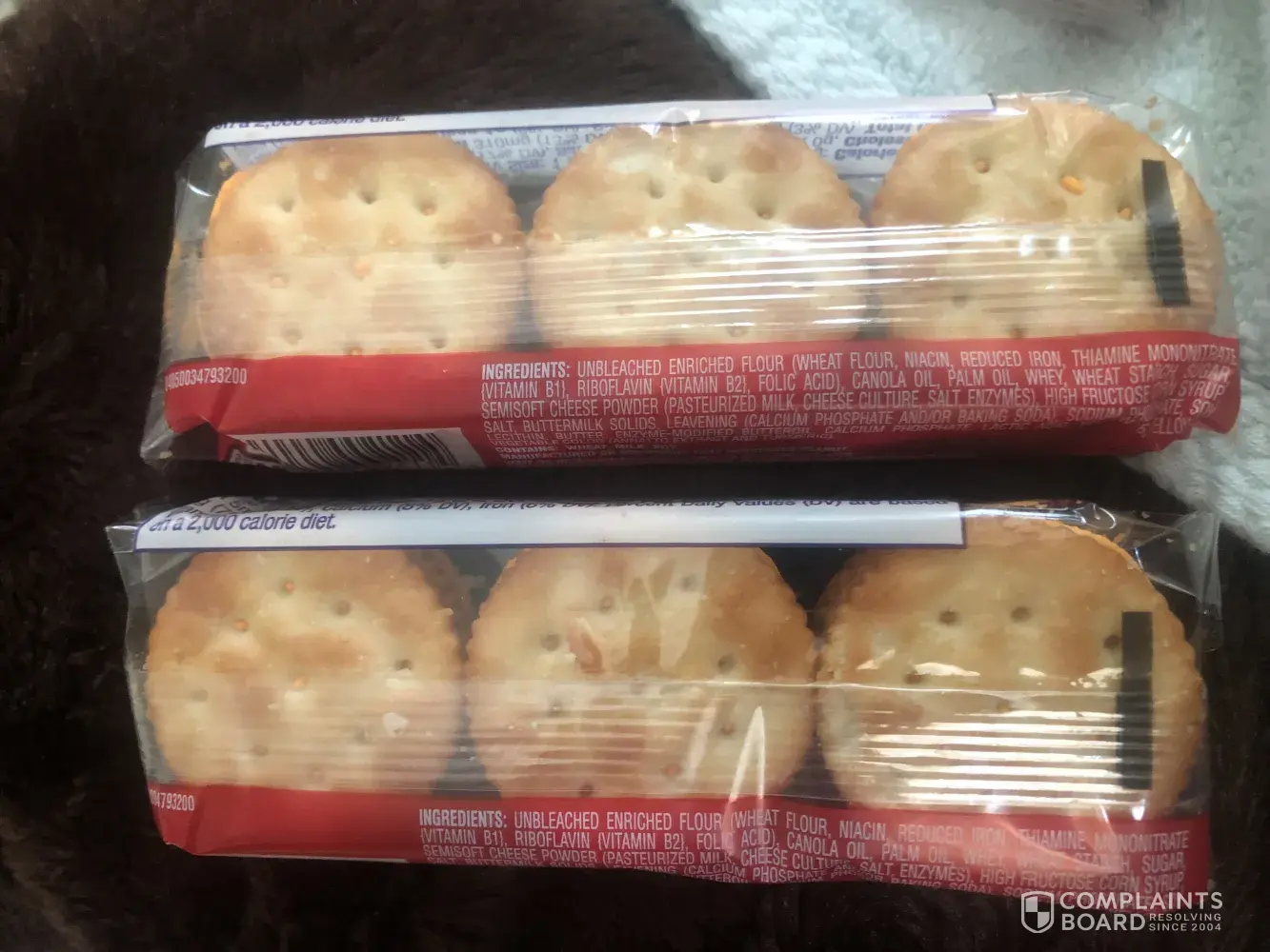 The last box of 8 packs of cheese crackers was burnt! I usually love these crackers and buy at least 6 eight packs a week. This burned problem has only happened once before. Please do whatever you need to in order to replace them.