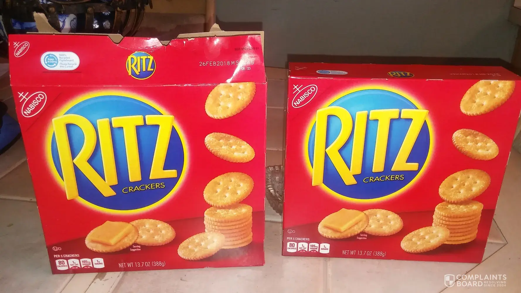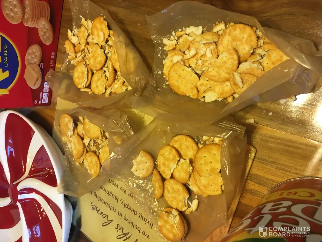 The 2 boxes of Ritz crackers was being used for a get together with family and friends. The morning of 3-17-2018 I started preparing for my get together and my crackers were falling apart as I was putting food on them, I did use about half of the 2 boxes but I don't think I will be purchasing your products for my events.