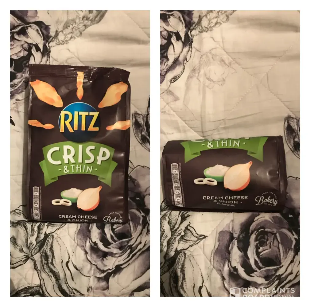 I have this evening purchased a bag of Ritz crisp and thin after being told they were really nice and I should try them, I was pleasantly surprised by the size of the bag im the shop, it seemed more than big enough for us to share. Once home and settled we opened the bag and to our disgrace the bag is less than half full with actual crisp/crackers! There is way more packaging than actual content. It's such a shame because what you think your buying is not actually what you get. Such a big disappointment. Why have such a big bag when there No need too? It's also very deceiving until the bag is opened. As you can see in the photo the size difference is a joke once the packet is opened x