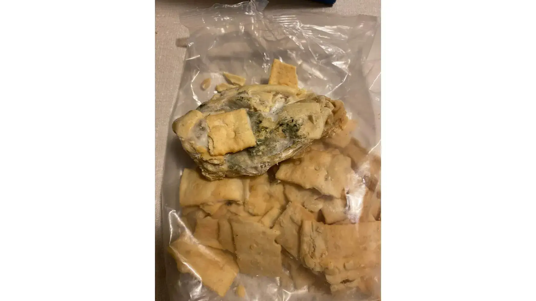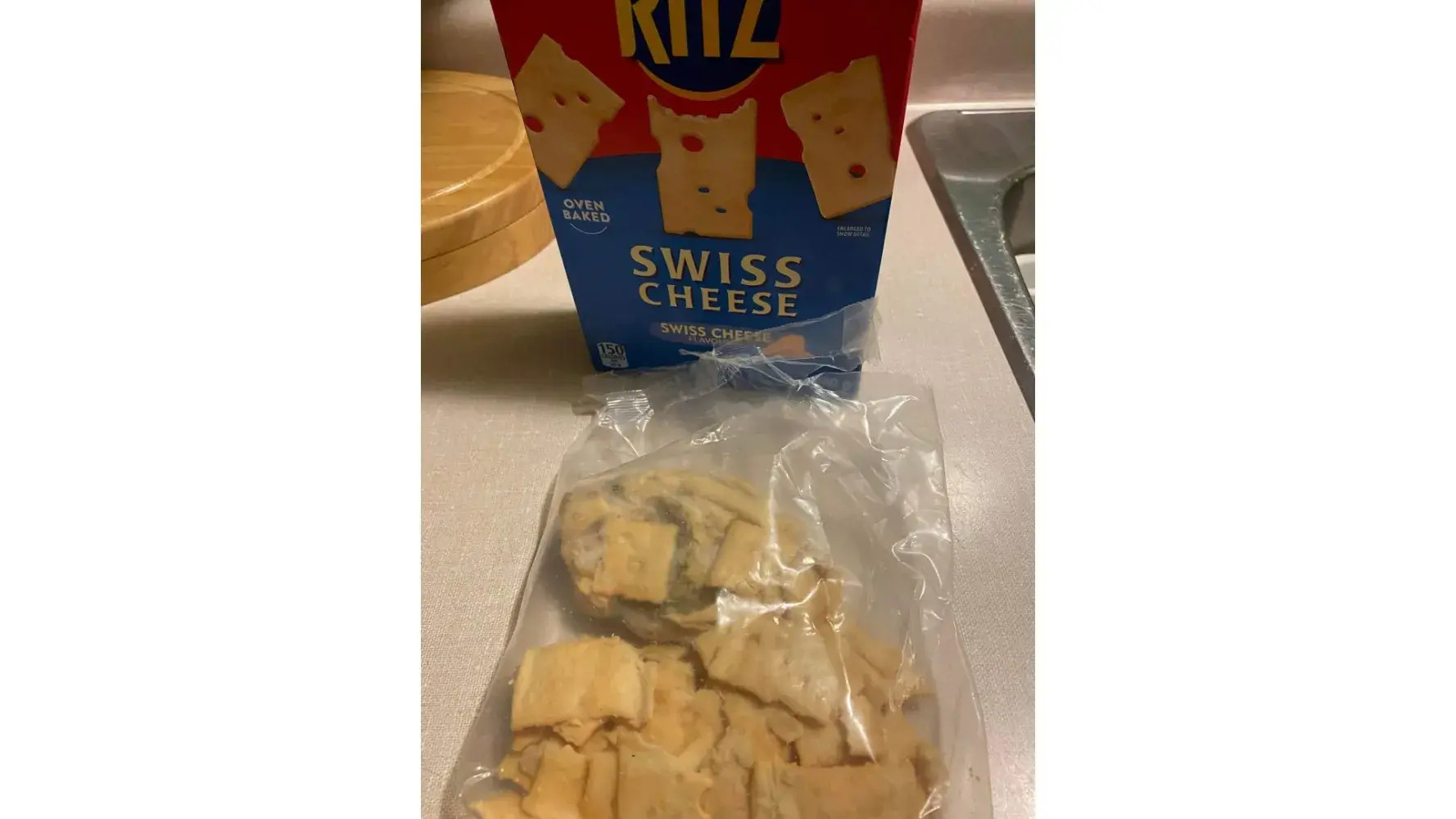 Opened a new box of Ritz Swiss Cheese and discovered a moldy clump of crackers at the top of the bag. Loose crackers were below the mass. It looked like they had laid inside a machine for a considerable length of time and then gradually come loose. I'm sure there are others who discovered the same problem. Purchased 1st week of January in Fredericton, NB at Giant Tiger store Northside.