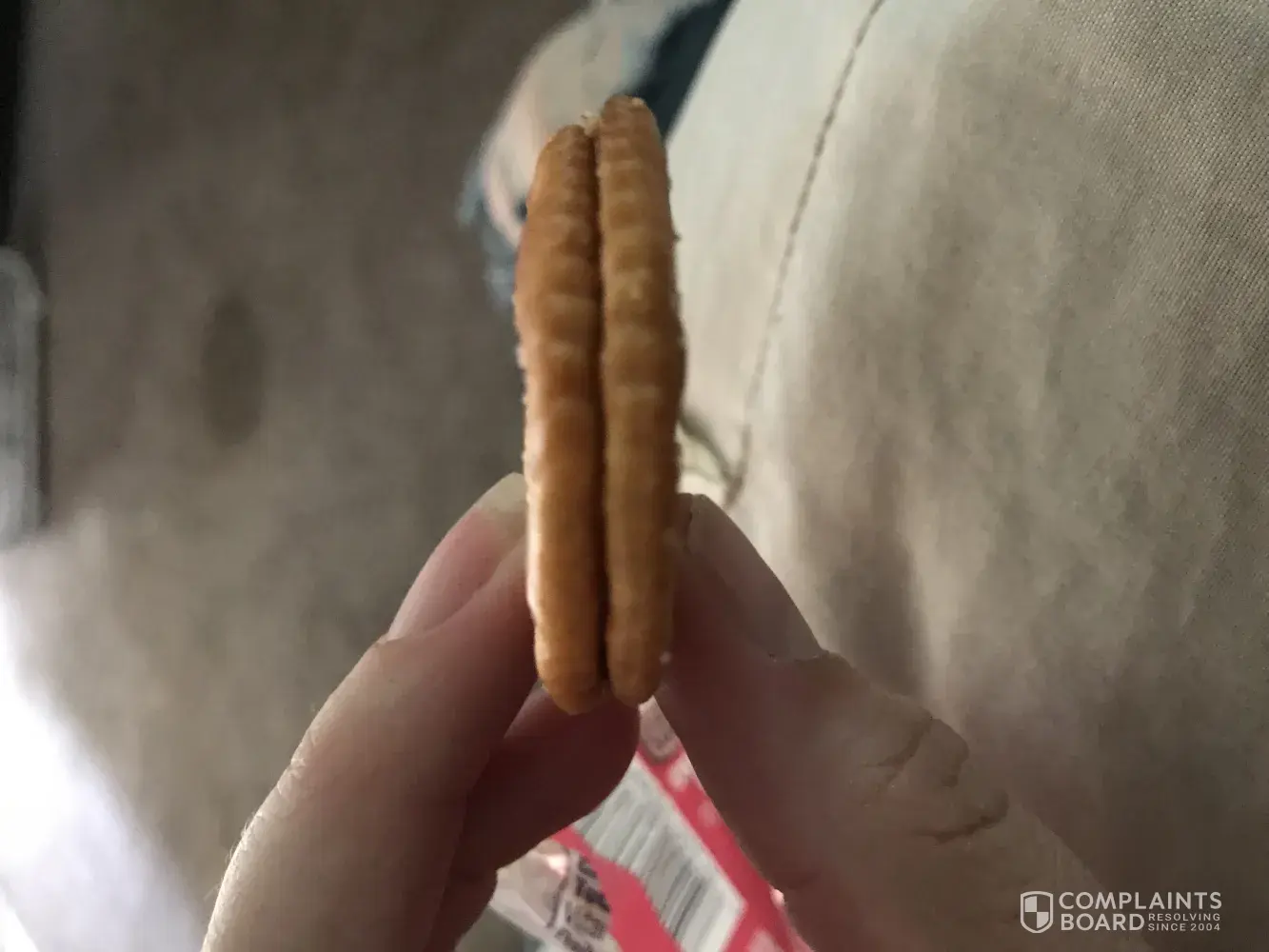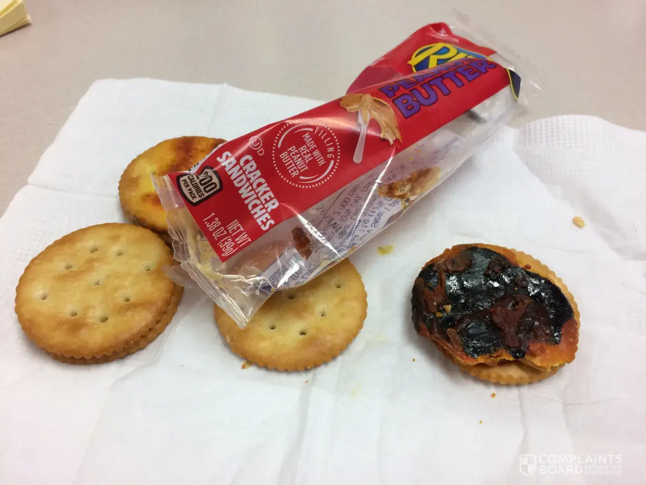 I opened a pack of peanut butter crackers and one was burnt and very disgusting. I literally almost vomited. I have included a picture. I don't how your inspection could let this be sent out