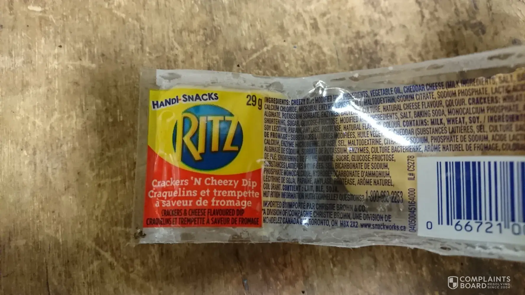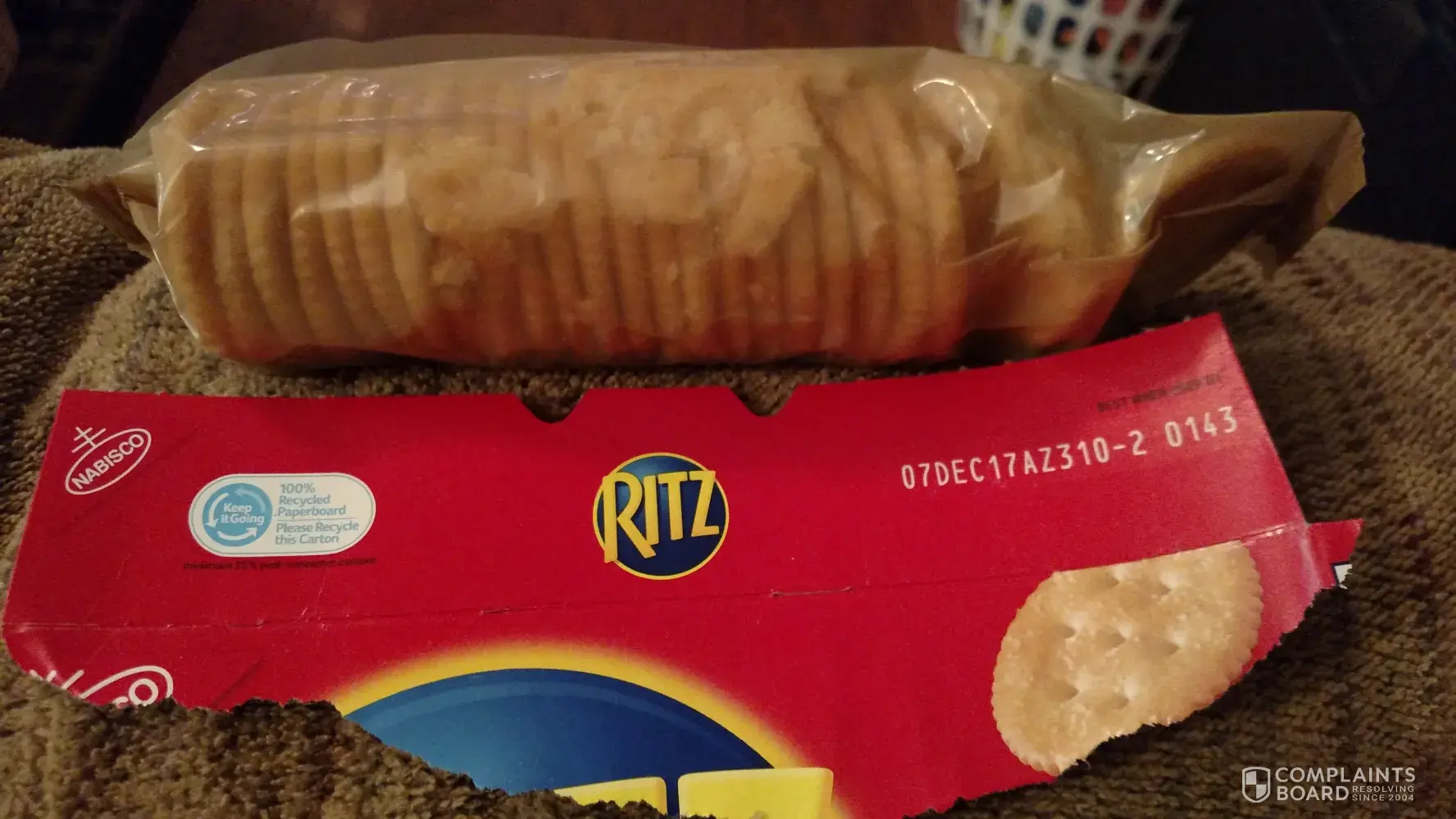 I bought ritz crackers and they were all open! Each sleeve had a long tear in them! My name is laurie deycaza! My address is 5325 W. 34th Place, Indianapolis, IN 46224! Please send me crackers or a voucher! Thanks