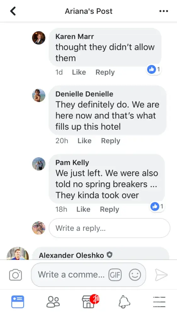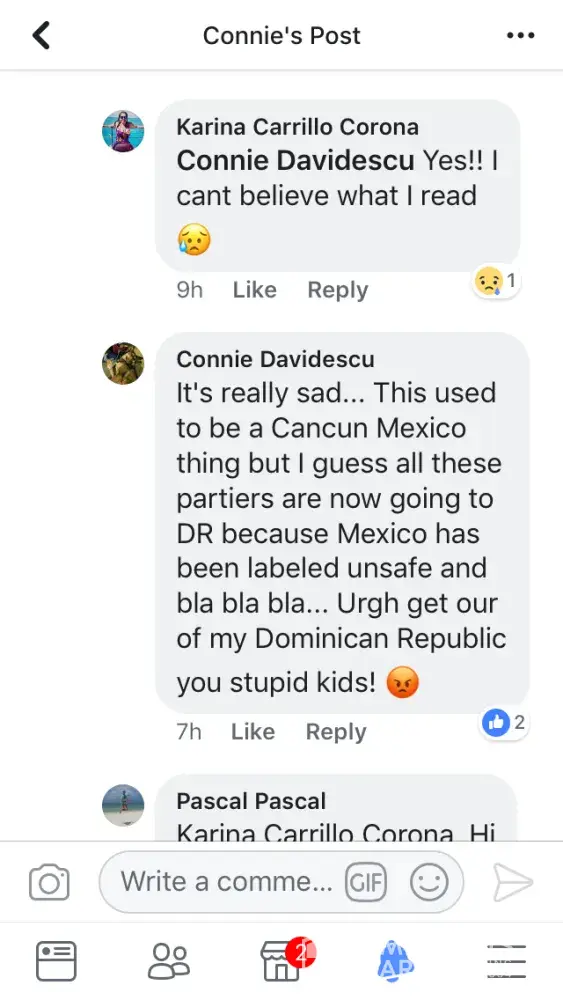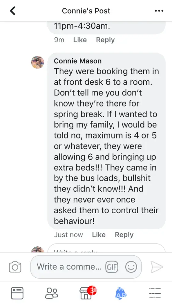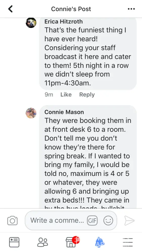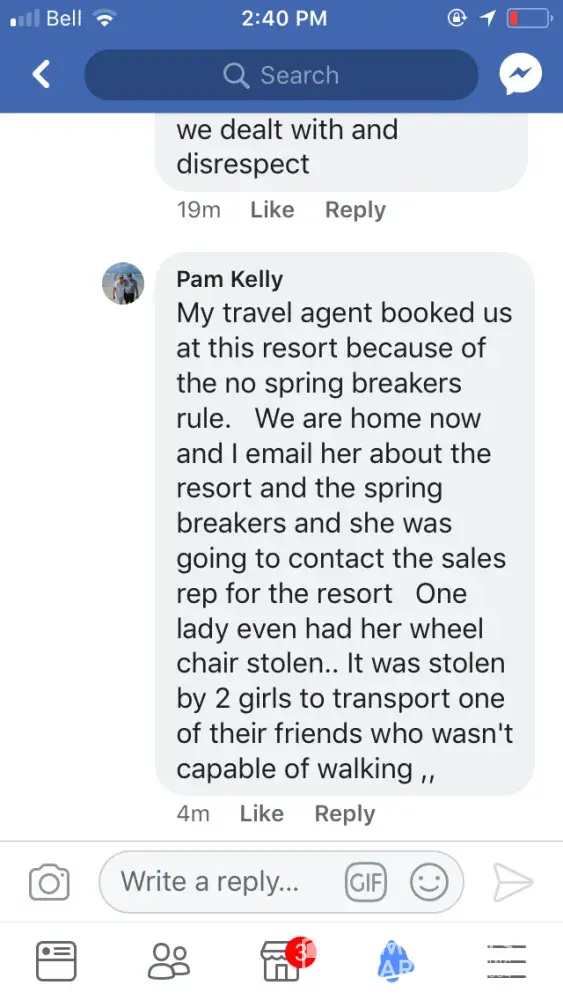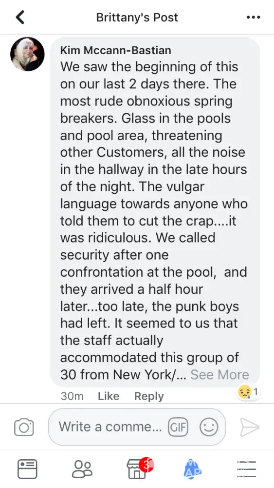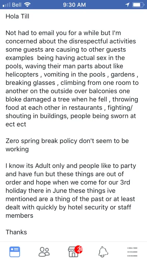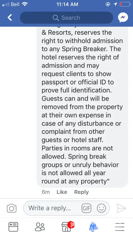 Spring break. Does it not say zero tolerance to spring break? There were thousands of kids. Fights, and glasses smashed in our hallways all night. Groups of kids outside room yelling and partying until past 4 am every night. Broken glass and broken plates of food everywhere. Smashing into doors, trying to open room doors not theirs, complained to front desk they basically said call us if you have a problem. Called 40 times one night. Zero answer. What if I was being attacked? What if my husband was having a heart attack? Spent $70 American at spa to have kids climbing over walls to try to break into Hot tub while I was trying to relax. Vomiting in pools, vomiting in hallways, over balconies, into courtyards, throwing garbage, bottles, cans, towels over balconies into courtyards, climbing walls to avoid paths, climbing room to room balconies on second floor, urinating in public, in hallways, in theatre, in courtyard (boys and girls) service in restaurants is non existent because of overcrowded rowdy groups who throw dishes and food over your heads while you're eating, dishes and garbage and food floating in dirty pools, plates of chicken bones, half eaten burgers all over beach, spilled into sand.Hundreds of Glasses discarded everywhere on beach. My husband swam in ocean and brought out stacks of glasses and straws every time he left the water. Stacks. Loud offensive behaviour, yelling at seniors, seen one trying to assault a older lady grabbing her behind. Never once seen staff asking them to stop. Bartenders were doing shots with young girls, we had to wait 10-15 min to get a drink (with a tip in hand) girls breaking toilet paper dispenser of bathroom walls, leaving every tap running for me to turn off, kids finishing drinks and throwing their glass behind them to smash on ground. This was nonstop behaviour. I did not pay that much money to deal with that. I demand some compensation for my horrible time.