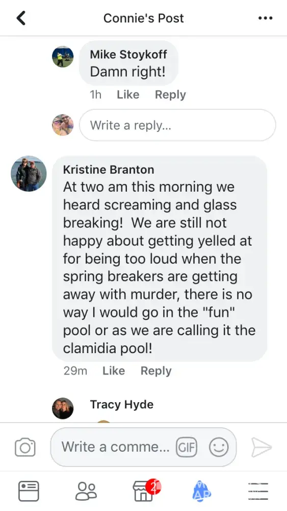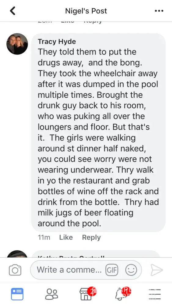 1. There was a guest at the pool that MANY people were complaining about. He was going through peoples pool bags, which was told to several of the staff and nothing was done. Then he started pushing children (including ours) off their pool floats. Again, we reported it and nothing was done. He then started pulling towels off guests. Eventually one of the pool staff finally asked him to stop but that was the extent of it and he still didn't leave. His friends finally got him to leave the pool. All of this lasted about 2 full hours.