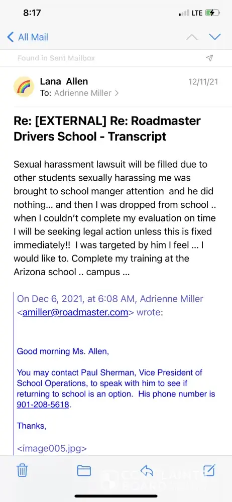 I was dropped from my course with out proper training and I was sexually harassed by other students and my school manger did nothing.. and then they let me go and sent me a bill.. I will be seeking legal action agains Roadmaster in Fontana ca my name isGemelis Allen attend 2021 and I'm pissed off after I told Human Resources on a email she stop contact with me.. and told me that's too bad I'm seeking legal advice