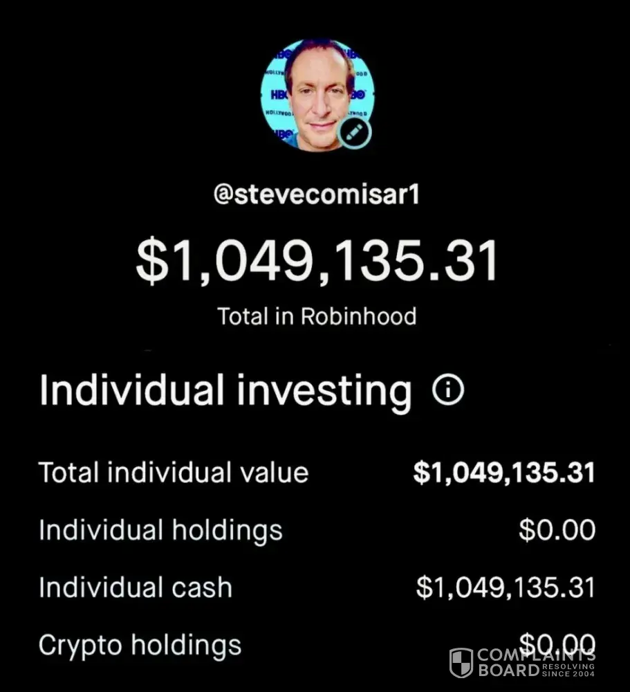 I had $1.2M in Bitcoin. Tried to transfer some money back to my bank account. They closed my account. Liquidated my bitcoin and refused to return my money. I googled: Robinhood + complaints and found hundreds of similar complaints. They just paid a $45M fine. But they are a huge company on the stock exchange and seemed legit. They robbed me! They have no...